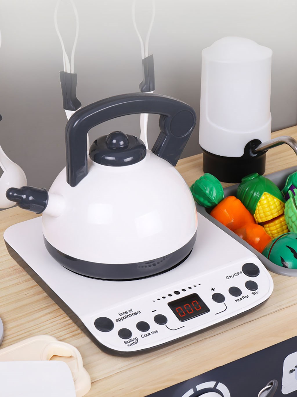 Součástí vybavení je také parní hrnec, jehož pokličku lze naplnit 40 ml vody, která se po stisknutí tlačítka uvnitř poklice promění v páru, čímž napodobí skutečné vaření. Dále zde naleznete rychlovarnou konvici s čtyřmi zvukovými efekty, víceúrovňovým nastavením výkonu a digitálním displejem.