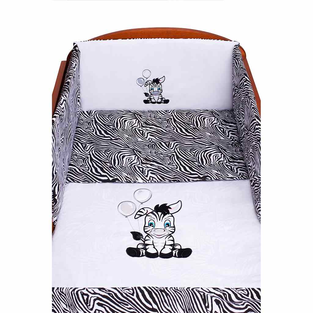 Dětská bavlněná 3-dílná souprava do postýlky New Baby Zebra pro miminka. Soupravu zdobí veselý obrázek zebry s pruhy a je celopotištěná výraznými černobílými pruhy. Je vyrobena z měkkého, příjemného materiálu. Souprava obsahuje povlečení na polštářek cca 40x60 cm, povlečení na peřinku cca 100x135 cm a mantinel cca 180 cm. Materiál 100% bavlna.
