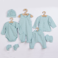 Roztomilá kojenecká 7-dílná soupravička české značky New Baby I AM pro miminka. Soupravička je vyrobena z velmi příjemného, měkkého a kvalitního materiálu, který je vhodný pro miminka a je vhodná nejen do porodnice. Obsahuje celorozepínací body s dlouhým rukávkem, dupačky, polodupačky, kabátek, čepičku, rukavičky a capáčky. Body má boční zapínání po celé délce a mezi nožičkama na cvočky. Dupačky mají zapínání na cvočky na ramínkách a mezi nožičkama, coš usnadní oblékání a přebalování. Kabátek má zapínání na cvočky po celé délce. Čepička s širším lemem dobře drží na hlavičce miminka a nepadá. Je velmi praktická a netlačí na hlavičku miminka. Rukavičky a capáčky mají širší stahovací manžetku. Celá soupravička má nový neobyčejný design s atraktivním vzorem látky. Je navržena s ohledem na potřeby miminka a je vhodná i jako milý dáreček. Soupravička je v praktické Eko krabičce. Složení: 100% bavlna.