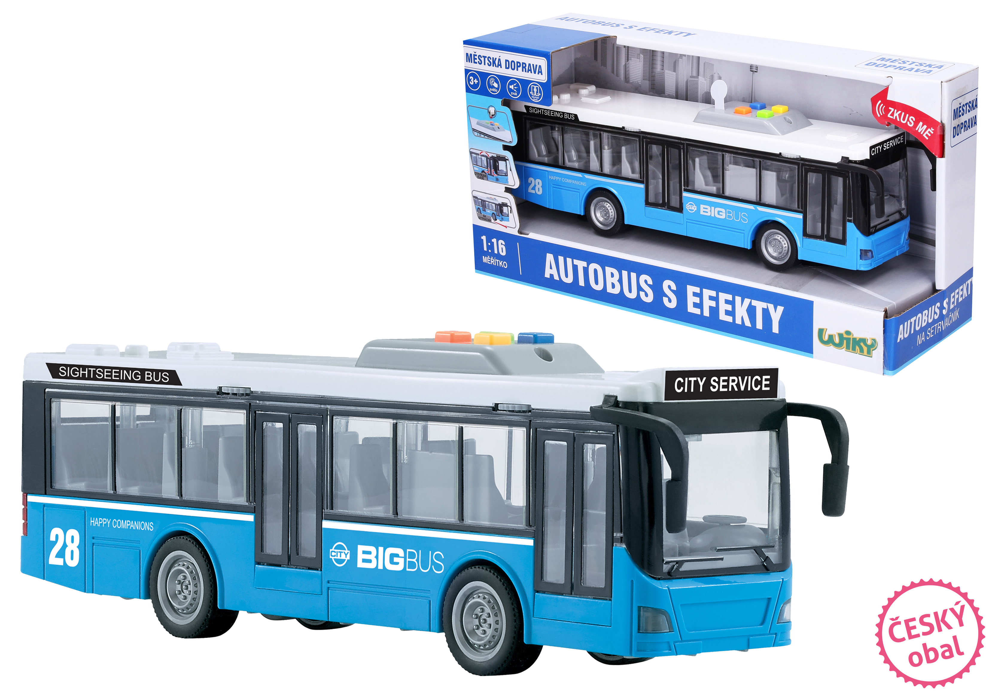 Autobus. Velikost 29 cm. Na setrvačník. Otevírací dveře. Světelné a zvukové efekty. 3xAG13 knoflíkové baterie součástí. Efekty se aktivují 4 tlačítky na střeše autobusu.