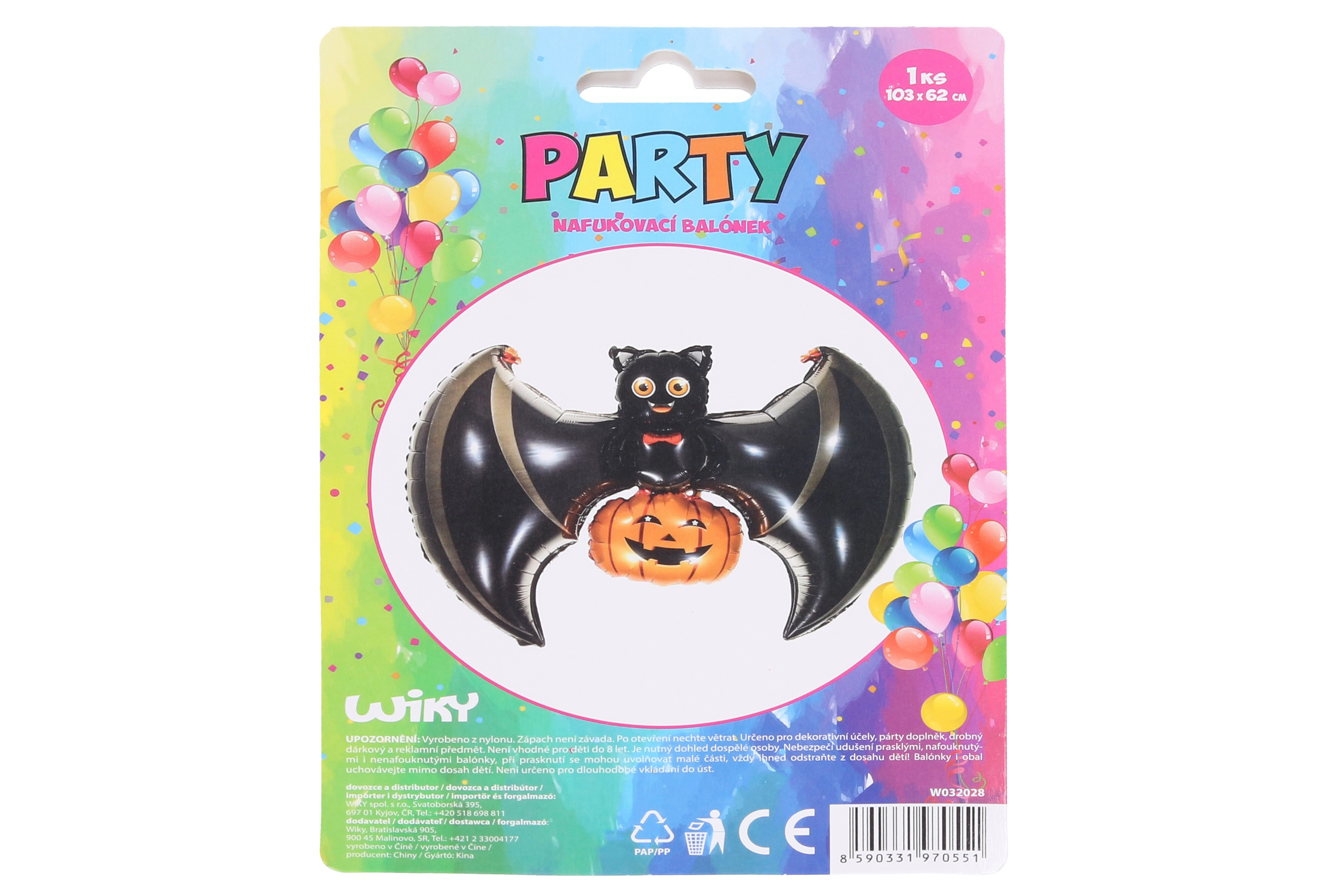Balónek nafukovací ve tvaru netopýra + dýně. Velikost ve vyfouklém stavu: 103x62 cm. Velikost v nafouklém stavu: 80x58 cm.