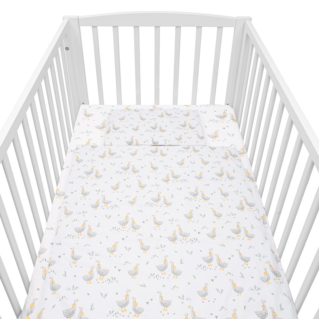 Nádherný bavlněný set s výplní do postýlky New Baby Husičky. Set obsahuje polštářek a peřinku s potiskem. Krásný dětský motiv s roztomilými husičkami, polahodí dětským očičkám. Set je vyplněn antialergickým vláknem a je ušit z vysoce kvalitní bavlny. Bavlněný set luxusně a jemně pohladí a zahřeje pokožku vašeho miminka. Rozměry: polštář: cca 60x40 cm, peřinka: cca 90x120 cm.