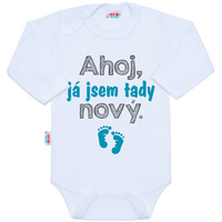 Originální bavlněné kojenecké body s dlouhým rukávem New Baby, s vtipným nápisem Ahoj, já jsem tady nový. Barvy použité k potisku jsou certifikované a vhodné pro miminka. Je vyrobeno z příjemného a kvalitního materiálu, ve kterém se bude Vaše miminko cítit příjemně. Body má zapínáni na cvočky na ramínku a mezi nožičkami, což usnadňuje oblékání a přebalování. Dopřejte Vašemu miminku vyniknout v originálním body. Složení: 100% bavlna. Rozměry: obvod kolem hrudníku cca 34 cm, délka rukávu cca 16 cm, celková délka cca 30 cm.