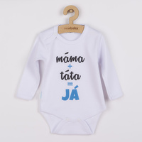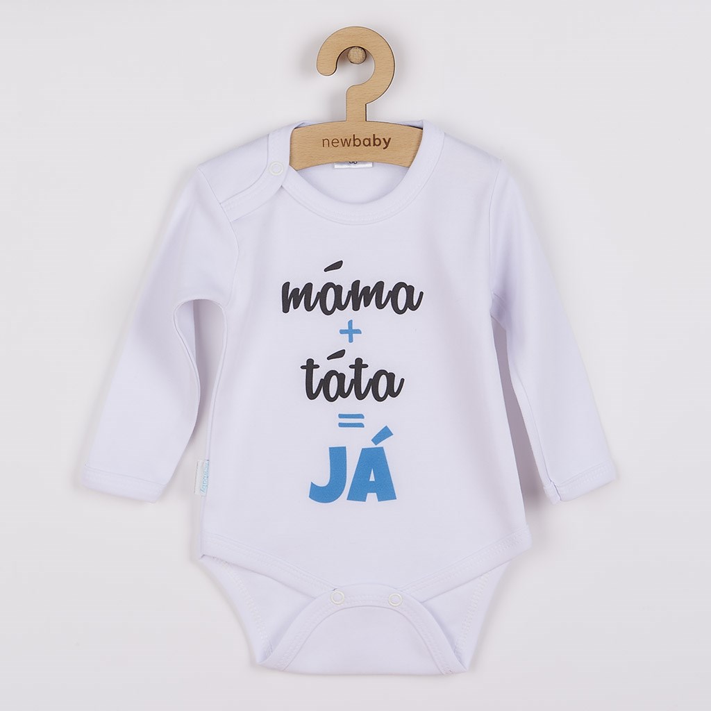 Originální bavlněné kojenecké body s dlouhým rukávem New Baby, s vtipným nápisem máma+táta=JÁ. Barvy použité k potisku jsou certifikované a vhodné pro miminka. Je vyrobeno z příjemného a kvalitního materiálu, ve kterém se bude Vaše miminko cítit příjemně. Body má zapínáni na cvočky na ramínku a mezi nožičkami, což usnadňuje oblékání a přebalování. Dopřejte Vašemu miminku vyniknout v originálním body. Složení: 100% bavlna. Rozměry: obvod kolem hrudníku cca 34 cm, délka rukávu cca 16 cm, celková délka cca 30 cm.