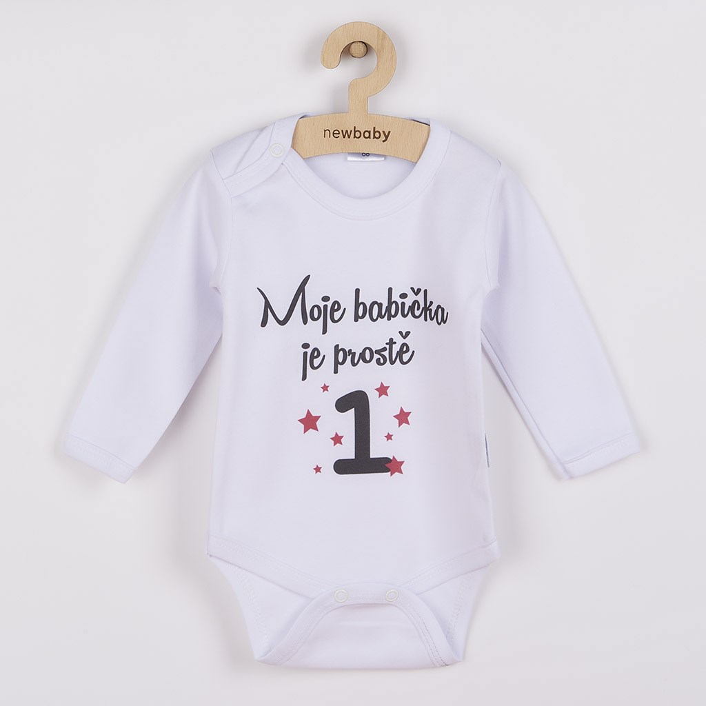 Originální bavlněné kojenecké body s dlouhým rukávem New Baby, s vtipným nápisem Moje babička je prostě jednička. Barvy použité k potisku jsou certifikované a vhodné pro miminka. Je vyrobeno z příjemného a kvalitního materiálu, ve kterém se bude Vaše miminko cítit příjemně. Body má zapínáni na cvočky na ramínku a mezi nožičkami, což usnadňuje oblékání a přebalování. Dopřejte Vašemu miminku vyniknout v originálním body. Složení: 100% bavlna. Rozměry: obvod kolem hrudníku cca 50 cm, délka rukávu cca 26 cm, celková délka cca 42 cm.