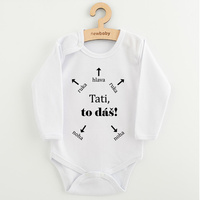 Originální bavlněné kojenecké body s dlouhým rukávem New Baby, s vtipným nápisem Tati, to dáš! Barvy použité k potisku jsou certifikované a vhodné pro miminka. Je vyrobeno z příjemného a kvalitního materiálu, ve kterém se bude Vaše miminko cítit příjemně. Body má zapínáni na cvočky na ramínku a mezi nožičkami, což usnadňuje oblékání a přebalování. Dopřejte Vašemu miminku vyniknout v originálním body. Složení: 100% bavlna. Rozměry: obvod kolem hrudníku cca 34 cm, délka rukávu cca 16 cm, celková délka cca 30 cm.