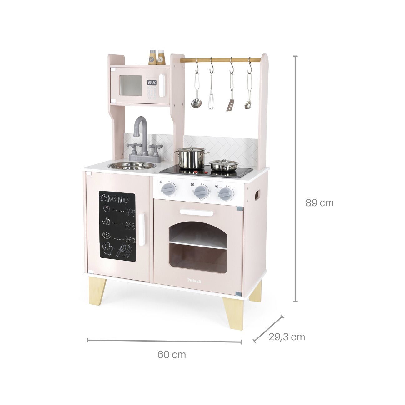 Každá kuchyňka má dřez, troubu a sporák, kde můžete vytvořit oblíbené pokrmy pro celou rodinu. Kromě toho si můžete své oblíbené recepty psát křídou na tabuli na přední straně kuchyňky. Postav hrnec na sporák, jehož hořáky se rozsvítí, a připrav libovolné jídlo pro panenky a medvídky. Vařič je vybaven potřebným příslušenstvím při vaření.