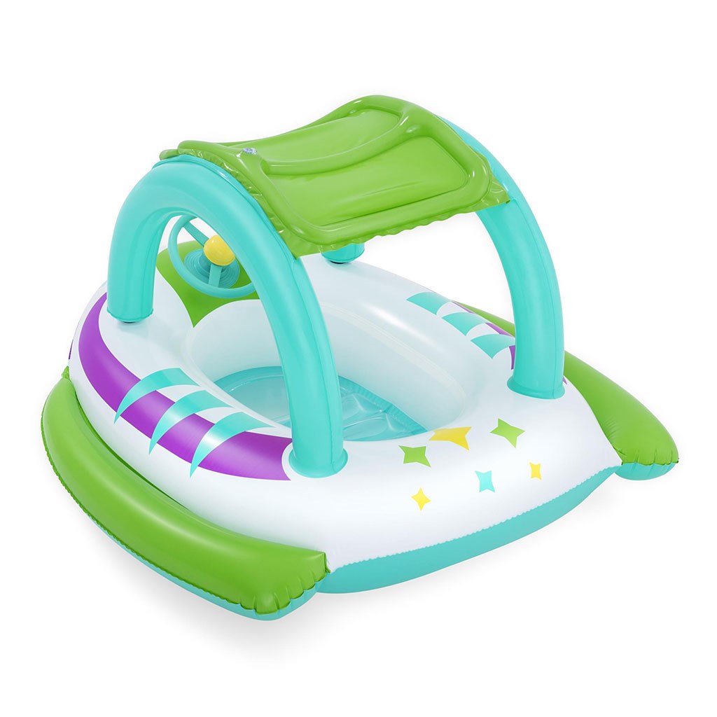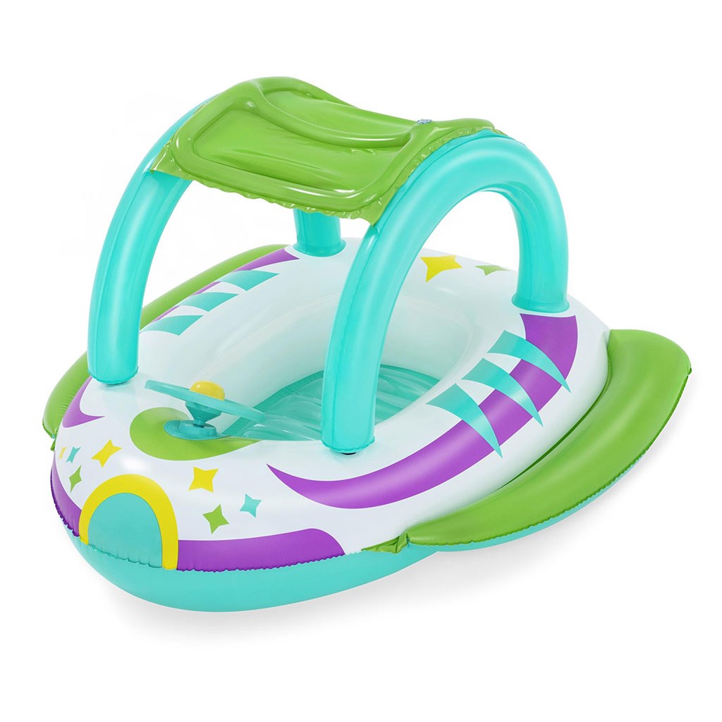 Dětský nafukovací kosmický člun Bestway. Krásný barevný dětský člun ve tvaru kosmické lodi se stříškou, která ochrání dítě před slunečními paprsky. Dovádění ve vodě milují všechny děti, proto dopřejte svým dětem pohádkové lenošení na vodě.