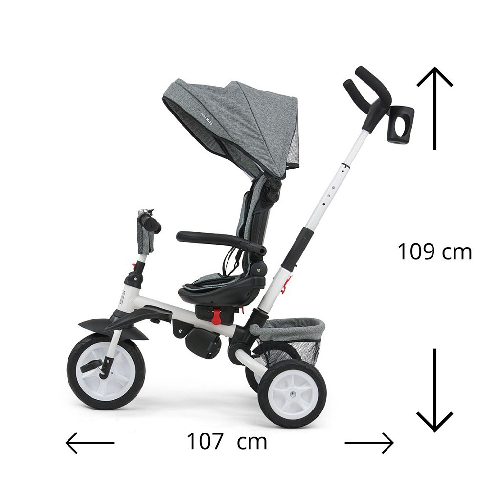 Je vyrobena z kvalitních a odolných materiálů. Má moderní konstrukci, pohodlné a ergonomicky tvarované sedadlo, které je otočné o 360 stupňů, což umožní dítěti cestovat ve směru nebo proti směru jízdy. O pohodlí a bezpečí během jízdy se stará bariérka, tříbodové bezpečnostní pásy, pohodlné stupačky nebo gumová kola, které skvěle absorbují rázy a poskytují dobrou přilnavost. Tříkolku může ovládat jak dítě, tak i rodič pomocí nastavitelné rukojeti pro tlačení. Po odebrání vodící tyče, sklápěcí stříšky, která chrání před sluncem nebo ostatních komponent bude sloužit jako tříkolka. Tříkolku lze používat rovněž jako alternativu golfového kočárku. Pro uložení hraček nebo potřeb pro dítě je zde praktický úložný košík.