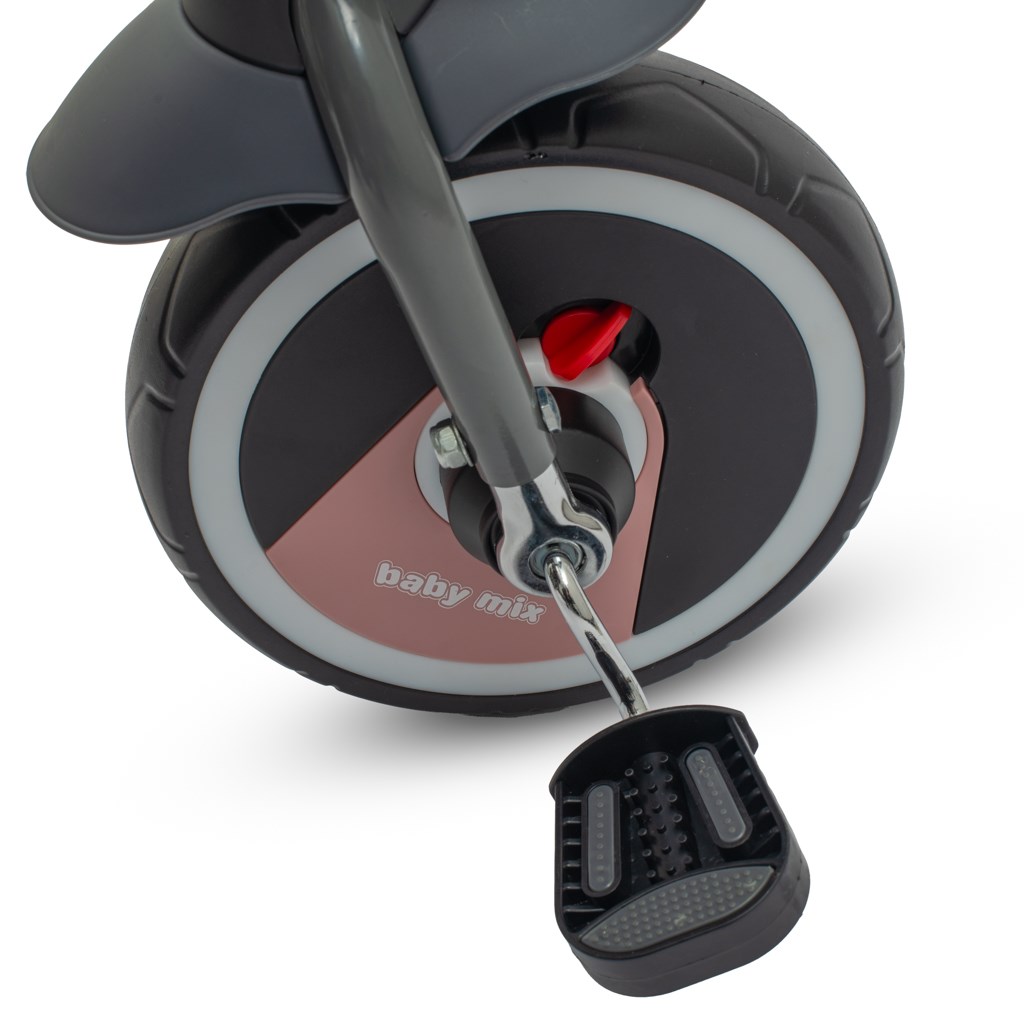 Dětská šlapací tříkolka Baby Mix 5v1 RELAX je multifunkční dopravní prostředek a je typickým příkladem produktů GROW UP - roste zároveň s dítětem. Tříkolku může ovládat jak dítě, tak i rodič pomocí nastavitelné vodící tyče. Po odebrání vodící tyče, sklápěcí stříšky, která chrání před sluncem nebo ostatních komponent bude sloužit jako tříkolka. Má moderní konstrukci, pohodlné a ergonomicky tvarované sedadlo, které je posuvné a otočné o 360 stupňů, což umožní dítěti cestovat ve směru nebo proti směru jízdy. Je vyrobena z kvalitních a odolných materiálů a skládací konstrukce umožňuje bezproblémovou přepravu tříkolky například v kufru auta. Její skládání je velmi jednoduché, intuitivní a nevyžaduje žádné nářadí. O pohodlí a bezpečí během jízdy se stará odnímatelná hrazda, pětibodové bezpečnostní pásy, pohodlné stupačky nebo kola vyrobena z tvrzené pěny EVA, která skvěle absorbují nerovnosti, poskytují perfektní přilnavost a nevyžadují huštění. Pro uložení hraček nebo potřeb pro dítě je zde praktický úložný košík.