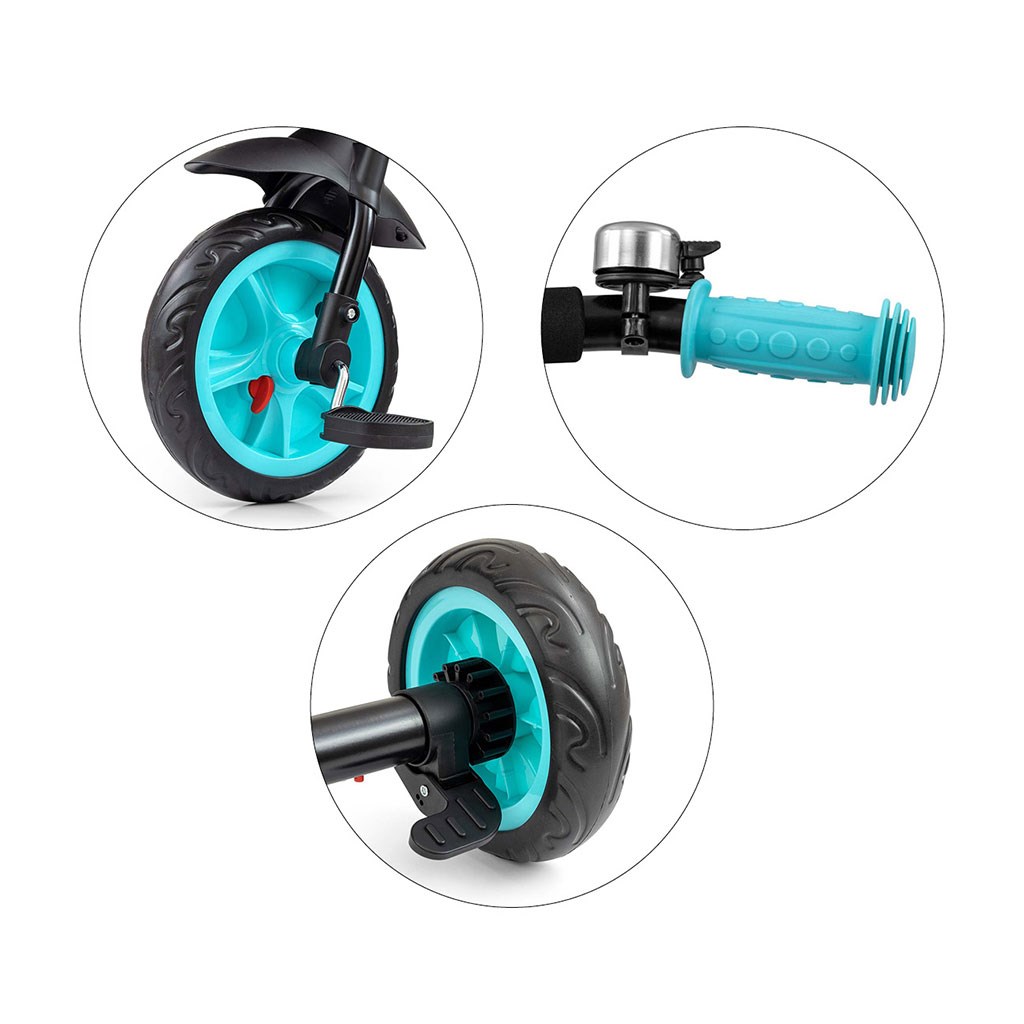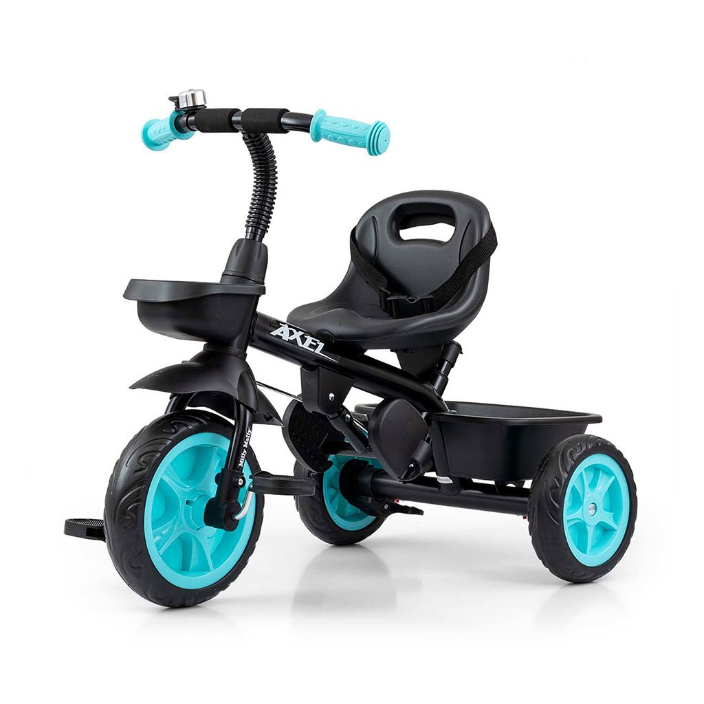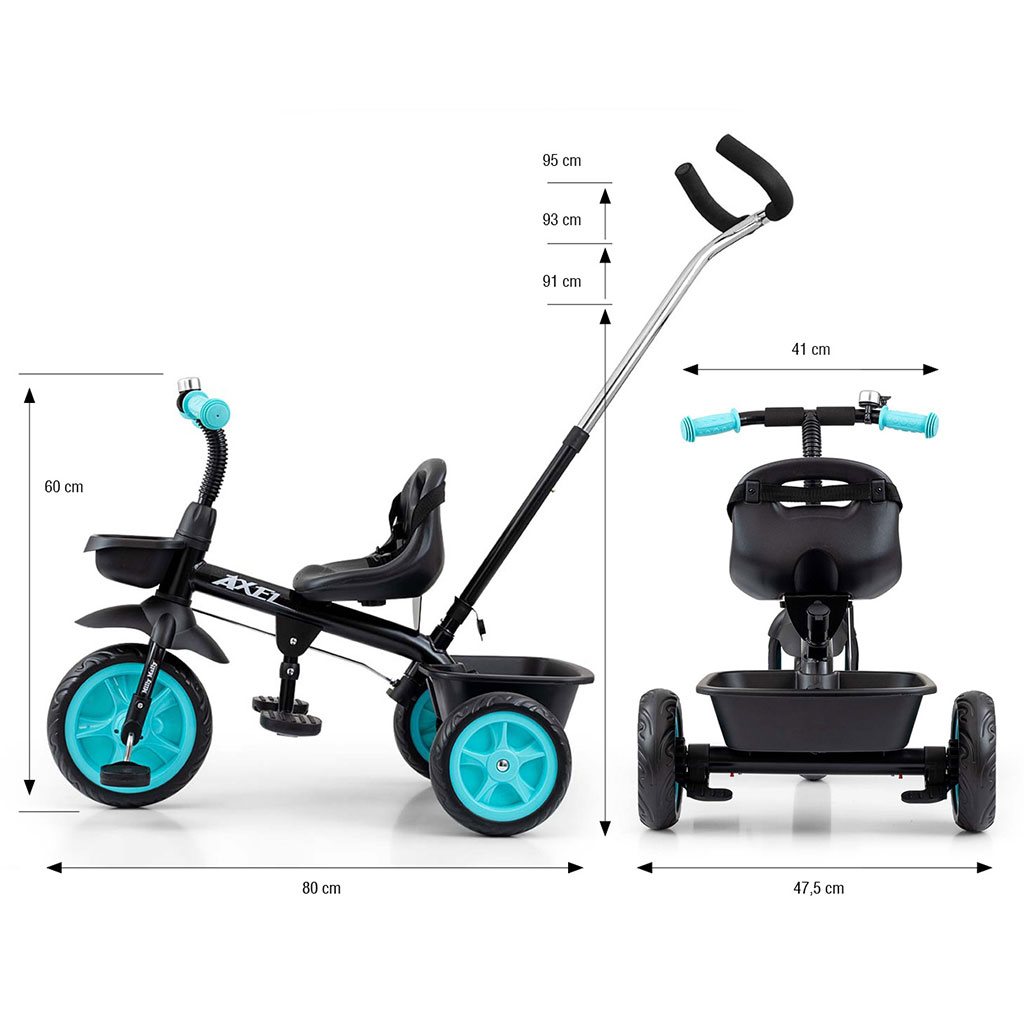 Dětská šlapací tříkolka s rukojetí Axel je určena pro děti ve věku od 1 do 3 let. Je vyrobena z kvalitních a odolných materiálů. Má pohodlné a ergonomicky tvarované sedlo, jehož vzdálenost k řídítkům lze snadno nastavit a tím přizpůsobit tříkolku věku a výšce dítěte. Tříkolka patří k produktům skupiny GROW UP, tedy roste s dítětem. Na předním kole lze uvolnit náhon na pedály a pomocí vodící tyče tlačit malého závodníka, když mu dojdou síly. Široká kola vyrobená z tvrzené pěny EVA, zaručí pohodlí a odolnost na každém povrchu. Do dvou praktických košíků si váš malý závodník naskládá všechny potřebné hračky a může vyrazit vstříc dobrodružství. Kombinace kovové konstrukce a součástek vyrobených z nejkvalitnějších materiálů zaručuje odolnost za všech podmínek. Pro maximální bezpečí dítěte má tříkolka bezpečnostní pásy.