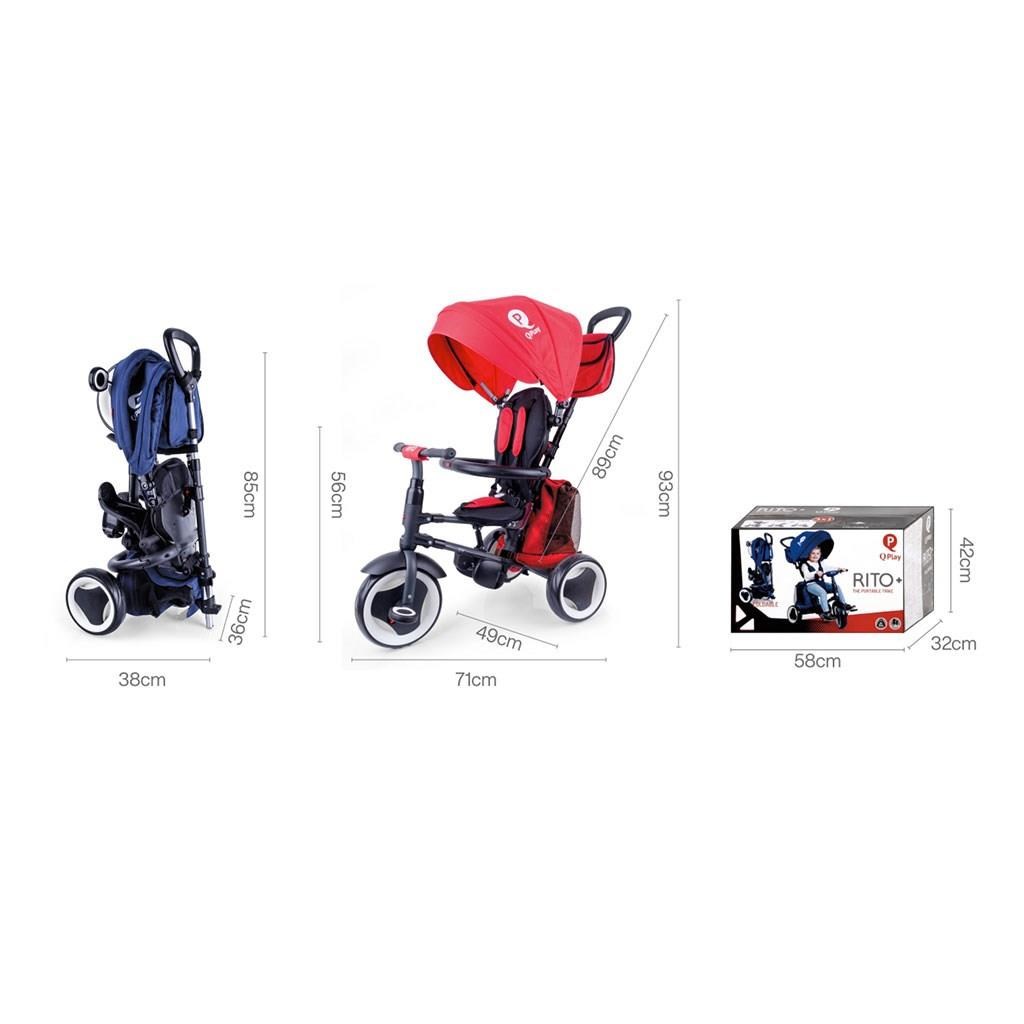 RITO PLUS je stabilní a bezpečná, má moderní design a pohodlně tvarované sedadlo. Tříkolka je vybavena bezpečnostní bariérkou, která nedovolí aby dítěvypadlo, pětibodovým bezpečnostním pásem, opěrkami nohou. Pěnová kola zajišťují tichou a pohodlnou jízdu. Po odstranění vodící tyče, bariérky, stříšky a potahu sedadla lze RITO PLUS používat jako klasickou tříkolku. Díky funkci "volné kolo a řídítka" může dítě volně šlapat a zatáčet, zatímco rodič má plnou kontrolu nad směrem a rychlostí jízdy. Kombinace kovové konstrukce, pěnových kol EVA a kvalitních plastů zaručuje odolnost a pohodlí.