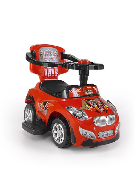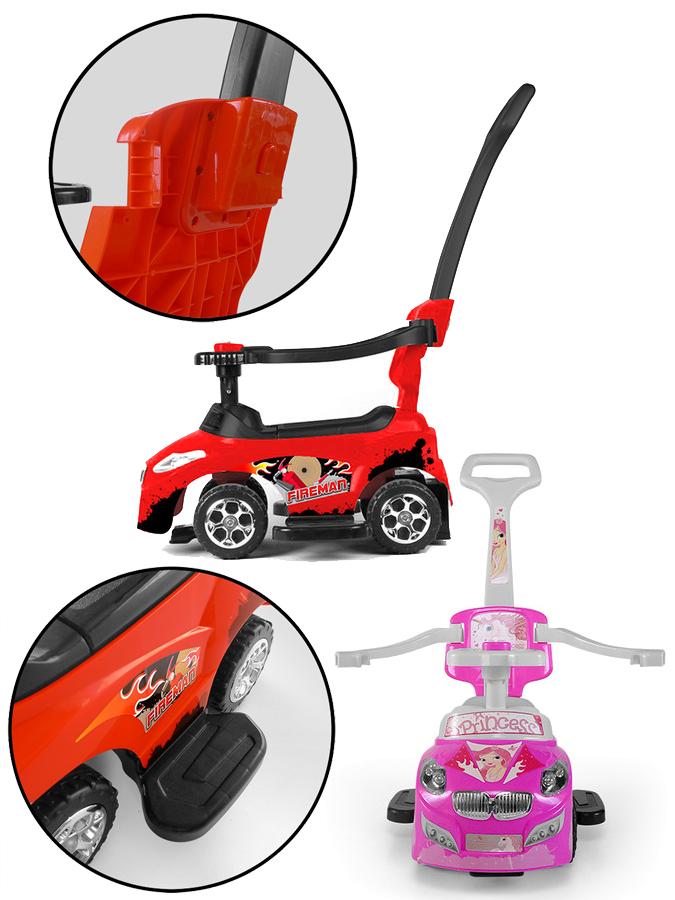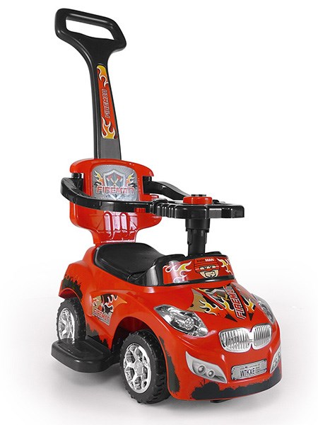 Dětské jezdítko Milly Mally Happy. Autíčko má na volantu tlačítko, které po zapnutí hraje melodie, a tlačítko, které po zapnutí vydává zvuk klaksónu. Jezdítko lze použít jako odrážedlo, nebo po přidání vodící tyče, stupátek na nohy a madel můžete dítě vozit sami a mít ho pod kontrolou. Je vyrobené z kvalitního plastového materiálu. Je to skvělá a bezpečná hračka. Tvar hračky pomáhá rozvíjet motorické schopnosti dítěte v době, kdy se učí chodit. Zaoblené hrany a pevná kola zajišťují bezpečnost při hraní. Baterie nejsou součástí balení.