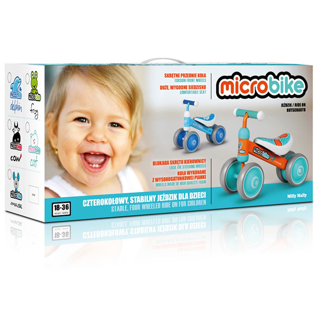 Dětské odrážedlo Milly Mally Micro. Odrážedlo je ideální v době, kdy se dítě učí držet rovnováhu. Je vyrobeno z kovového materiálu s cílem zajistit dítěti radost z jízdy a je doplněno veselými barvami. Odrážedlo je extrémně lehké, velmi stabilní, malých rozměrů vhodné na doma i ven. Kolečka jsou pěnová, neklouzavá a také jezdí na různých površích. Je tou nejlepší alternativou pro kolo s bočními kolečky, takže pozdější jízda na klasickém kole bude mnohem snadnější. Kolo je bez pedálů a brzdy, díky čemuž se dítě dokáže soustředit hlavně na držení rovnováhy a směr jízdy. Krásný a moderní design. Sedadlo je ozdobeno krásným obrázkem zvířátka. Ideální pro malé dětičky.