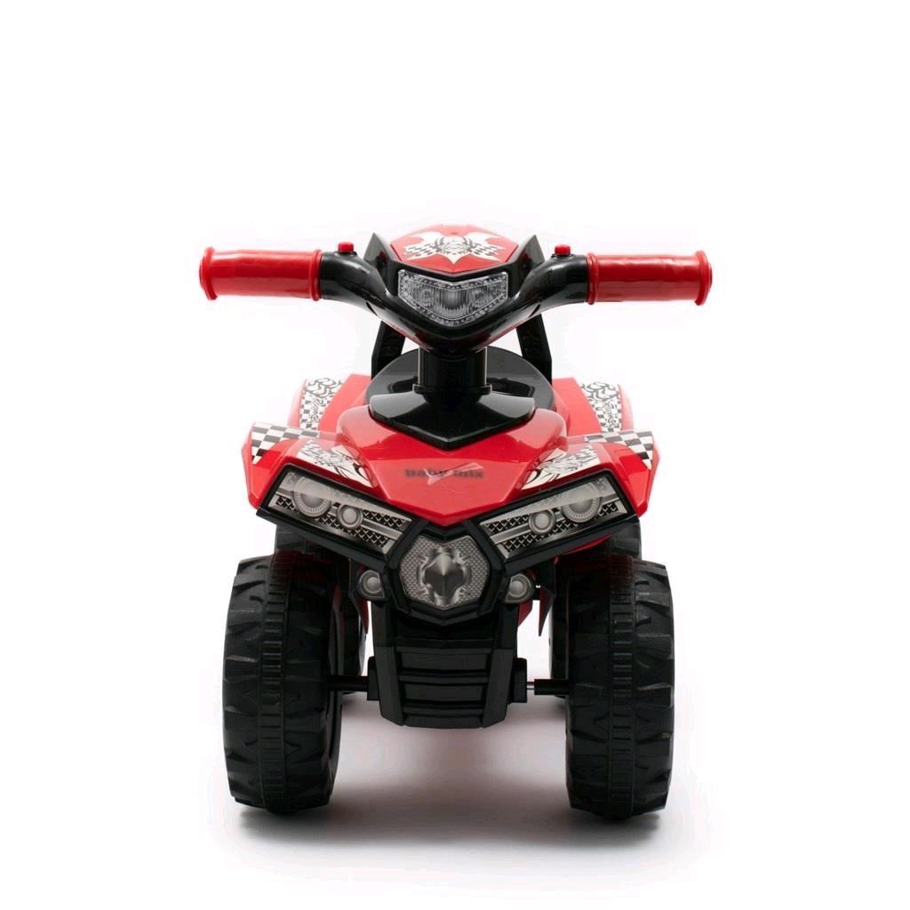 Skvělá Čtyřkolka Baby Mix se třemi melodiemi, klaksonem a blikajícími světýlky na řídítkách. Čtyřkolka má veselé barvy a je vyrobena z kvalitního a pevného plastového materiálu. Odrážedlo pomáhá rozvíjet motorické schopnosti dítěte a zaručí mu spoustu zábavy a legrace. Je určeno jak pro nejmenší děti, které už umí sedět, tak i pro děti, které se už naučily chodit. S čtyřkolkou si Vaše dítě užije spoustu legrace a zábavy. Naše super čtyřkolka skvěle vypadá, má komfortní široké sedadlo, široká řídítka a velká plastová kola. Na řídítkách má efektní houkačku a tlačítko se třemi uloženými melodiemi. Baterie nejsou součástí balení (2x AA 1.5V). Barvy samolepek se mohou lišit dle aktuální nabídky.