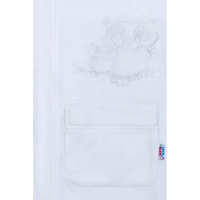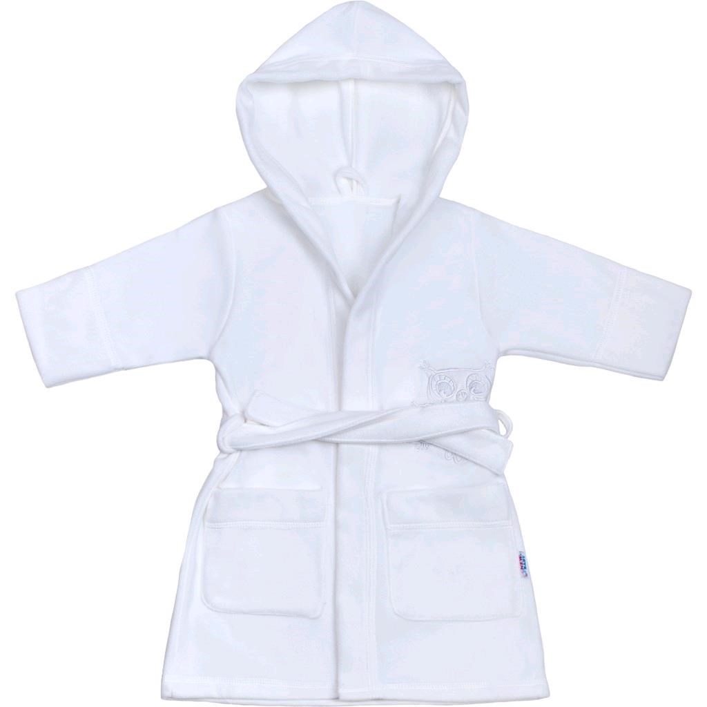 Nádherný dětský župan New Baby Sovičky. Župan je vyroben z příjemného a hřejivého materiálu. Župan zdobí obrázek soviček, kapuce a dvě kapsy. Kapucka chrání mokrou hlavičku před chladem a měkký, teplý materiál je ideální pro citlivou dětskou pokožku. Dětský župan se zavazuje na šňůrky. Ideální nejen po koupeli, ale také po koupání v bazénu či v moři. Rozměr: délka od ramínek cca 68 cm, obvod kolem hrudníku cca 82 cm, délka rukávu cca 35 cm. Složení 100% polyester.