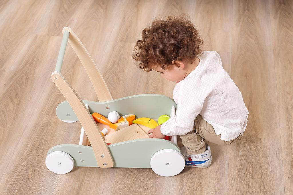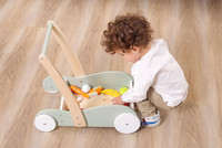 Hračka s jednoduchým designem je navíc vybavena velkými protiskluzovými koly a stabilní pevnou rukojetí. Velký úložný prostor umožňuje přepravu hraček různých velikostí a množství.