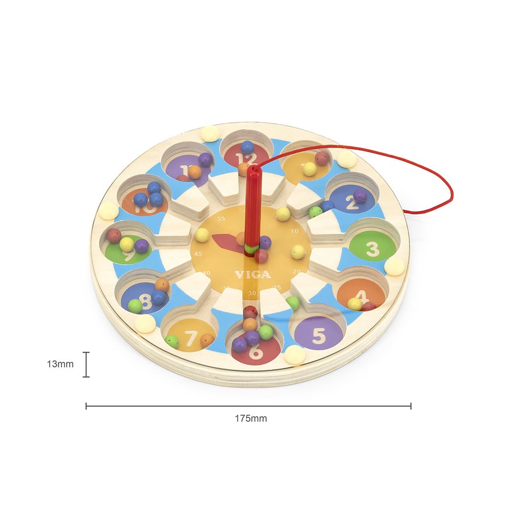 Magnetický labyrint od společnosti Viga je ideálním dárkem, který potěší každé dítě. Na dřevěné základně je dvanáct kruhů odpovídajících hodinám, do kterých je třeba pomocí magnetické tužky navést příslušný počet kuliček.