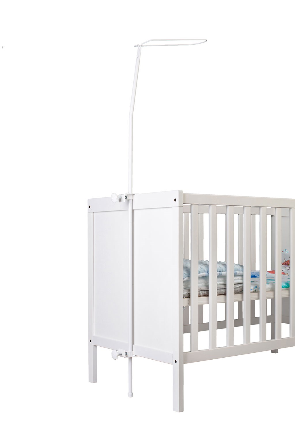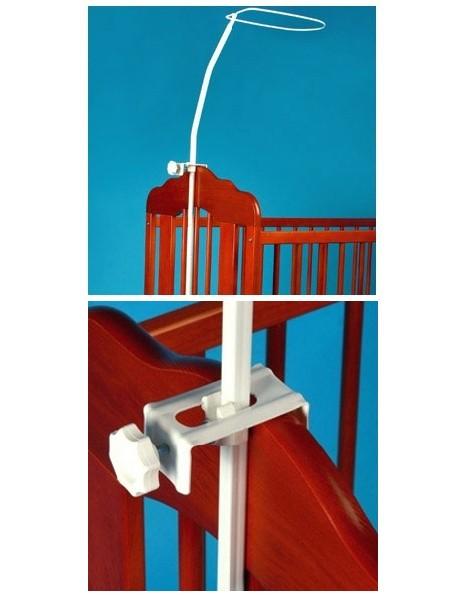 Šroubovací držák na nebesa se dvěma úchyty s dotahovacími šrouby. Úchyty je možno libovolně posouvat a přizpůsobit tak postýlce. V horní části držáku je drát pro uchycení nebes.
