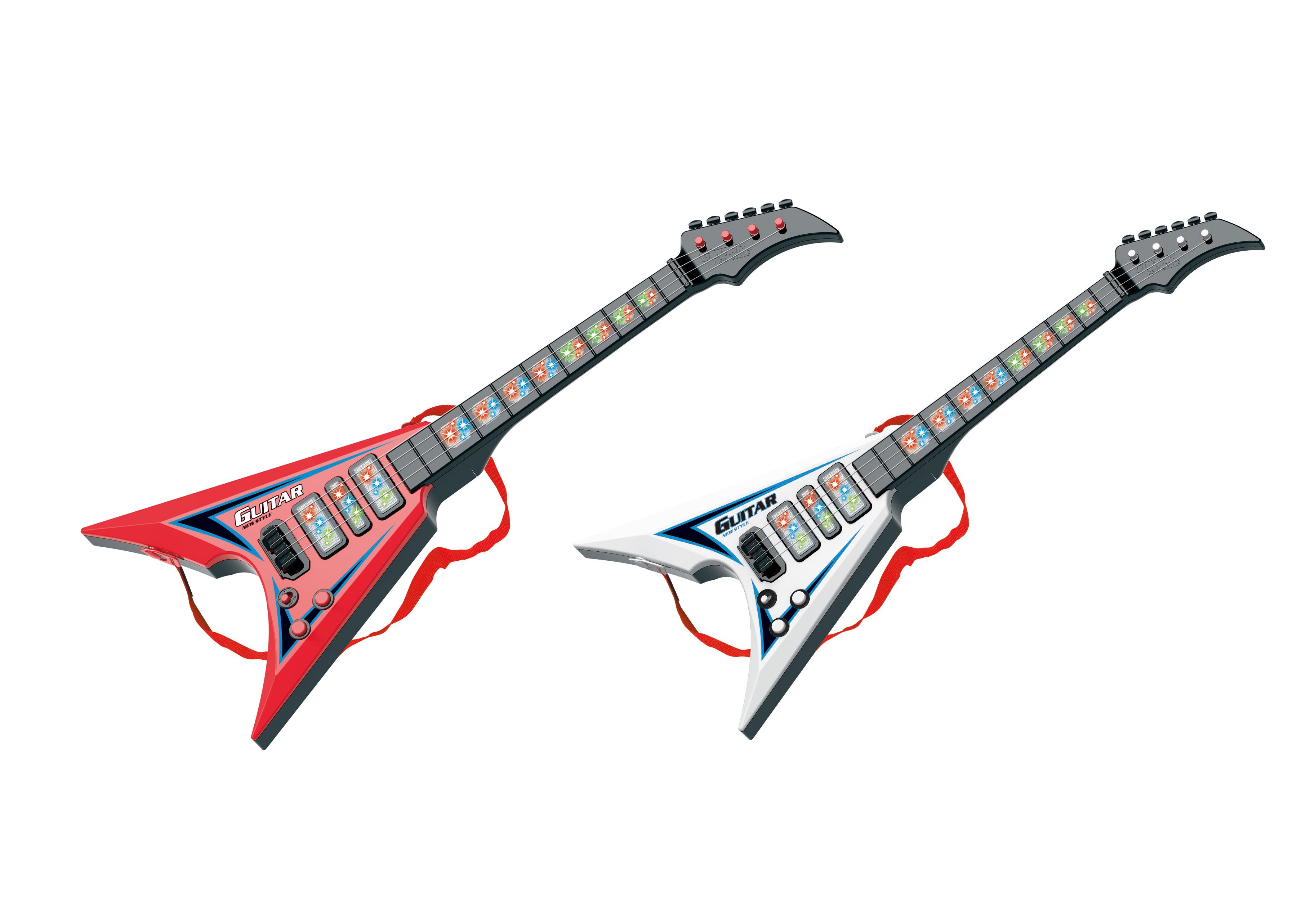 Elektrická kytara. Rozměry 22x5x56 cm. Světelné a zvukové efekty. 3xAA baterie nejsou součástí. Přepínač ON/OFF vedle potenciometrů. Oba potenciometry světelné a zvukové efekty. 2 varianty - bílá, červená.
