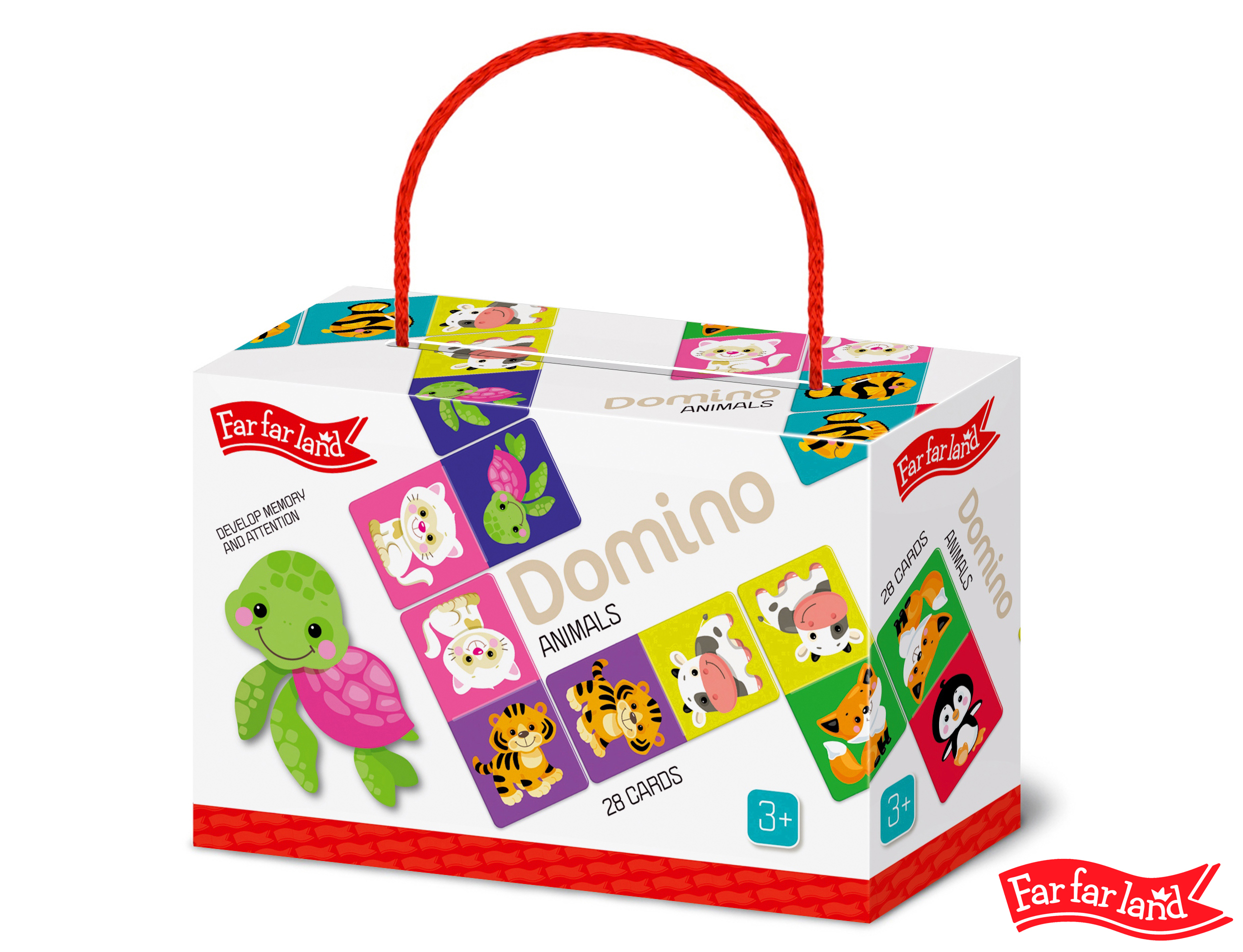 Far Far Land Domino s obrázky zvířátka. Balení obsahuje 28 karet. Hra pro 2-5 hráčů. Při hře 2 hráčů každý hráč dostane 7 karet. Při hře více hráčů každý dostane 5 karet. Zbývající karty jsou v "banku.“ Hráč, který má "dvojitou" kartu (kartu s totožnými obrázky), hraje první. Pokud žádný z hráčů nemá dvojitou kartu, každý hráč si vezme jednu kartu z banku. Pokud má více hráčů dvojitou kartu, začíná ten mladší. Pro rozehrání prvního tahu si však můžete vymyslet svá vlastní pravidla. Hráči se střídají a jeden za druhým přikládají karty ze své ruky ke kartám na hrací ploše se shodným obrázkem. Pokud hráč nemá shodný obrázek, musí si vzít kartu z banku. Hráč, který položí svou poslední kartu na hrací plochu, vyhrává. Pokud všichni hráči mají v ruce karty, ale není možné hrát dál, hra je ukončena "blokem" a vyhrává hráč, který má v ruce nejmenší množství karet.