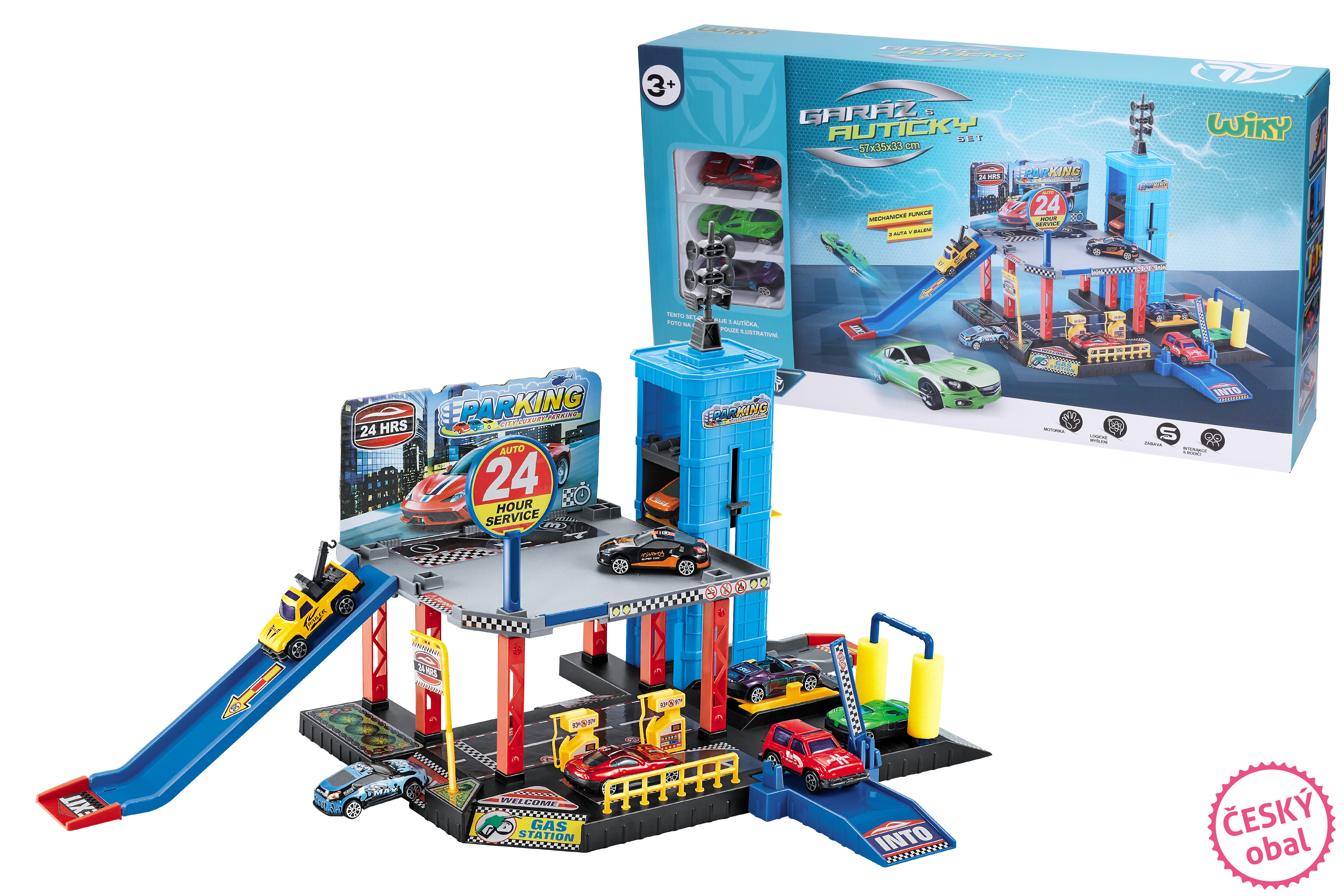 Garáž s výtahem a čerpací stanicí. Rozměry sestavené garáže 57x35x33 cm. Balení obsahuje 3 kovová autíčka 7 cm, volná kola.