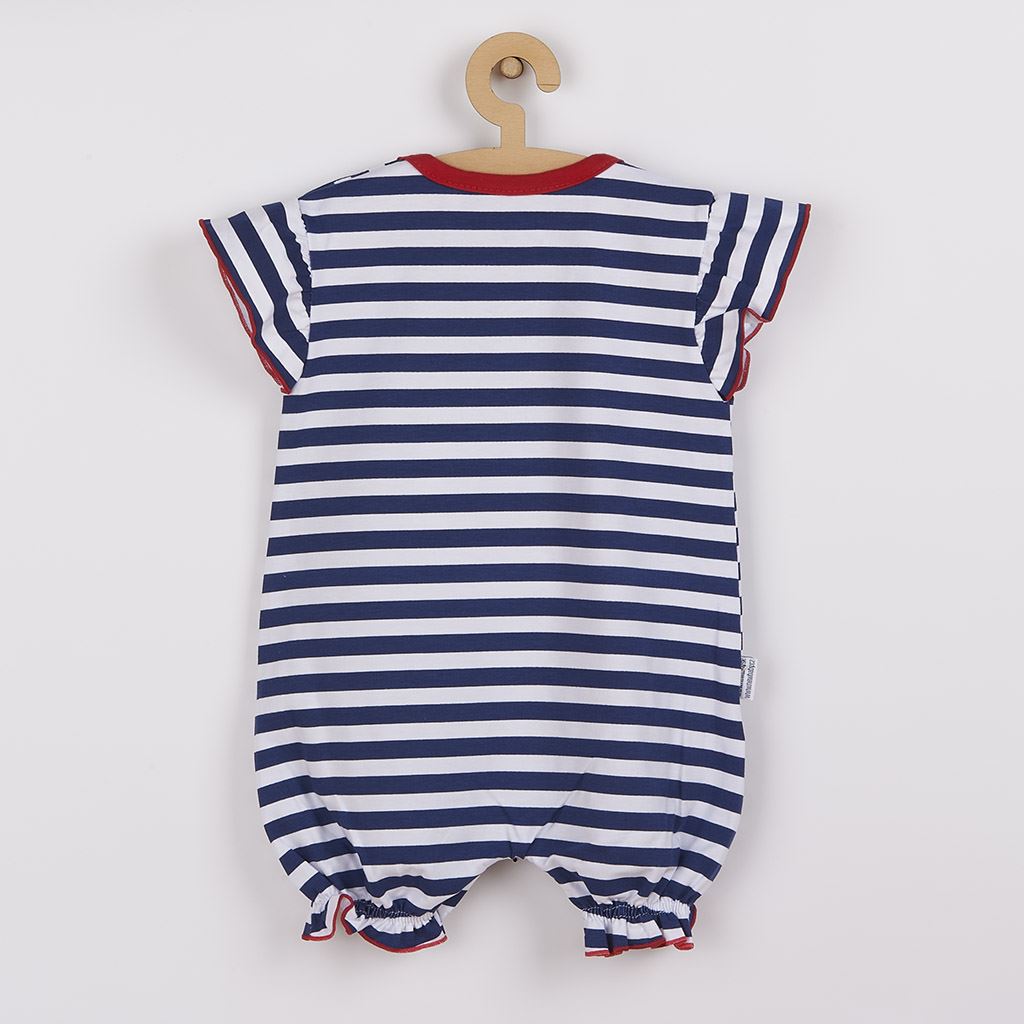 Stylový letní bavlněný overal s krátkým rukávem české značky New Baby Marine. Overálek s krátkým volánkovým rukávem celopotištěný moderními pruhy s nášivkou kotvy. Nášivka je podlepená látkou proti poškrábání. Má praktické zapínání na cvočky na ramínku a mezi nožičkama, což usnadní oblékání a přebalování. Super stylový letní motiv rozzáří každé miminko. Klademe důraz na kvalitu a proto se díky příjemnému, měkkému a kvalitnímu materiálu, bude Vaše miminko cítit velmi příjemně. Složení: 100% bavlna.