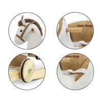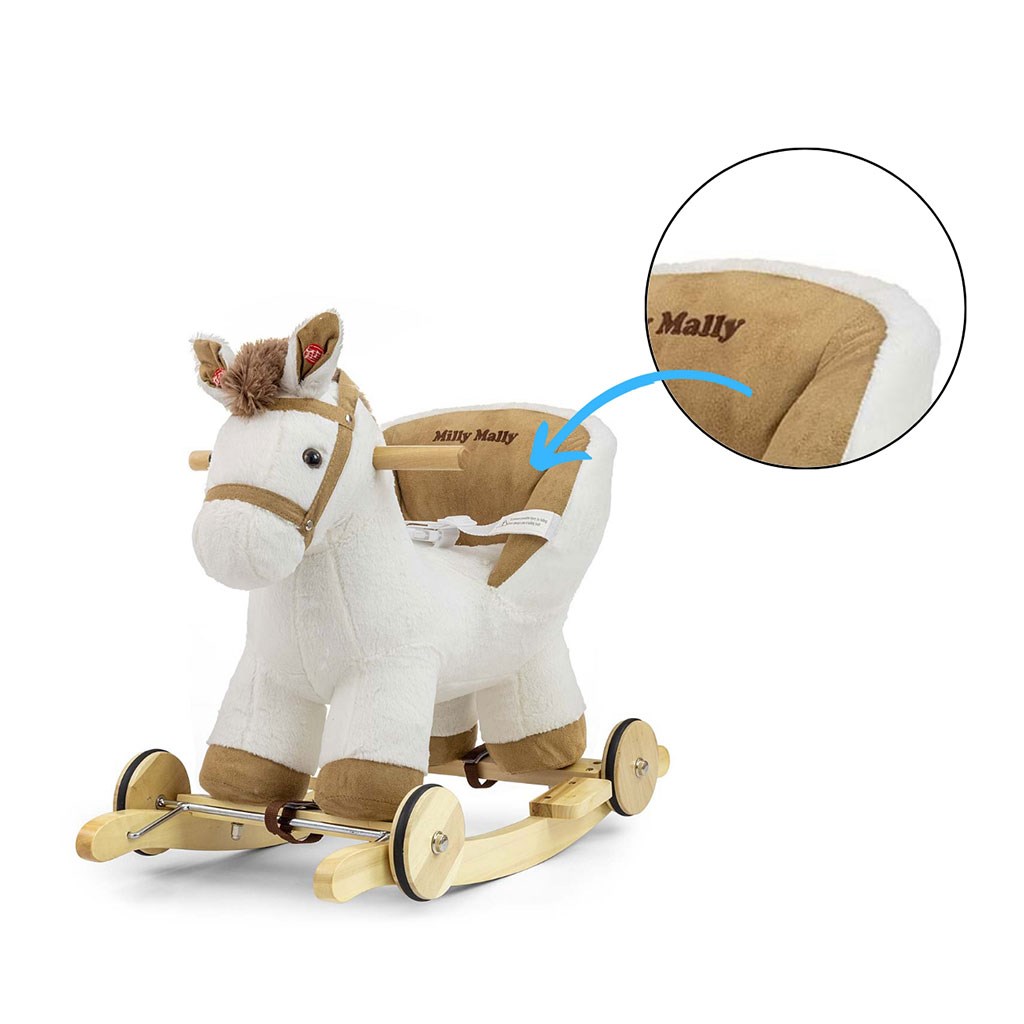 Měkoučký houpací koník Polly byl navržen pro nejmladší děti, pro které jsou tradiční houpací koně příliš velké. Pohodlné a tvarované sedadlo ve tvaru křesla a nastavitelné popruhy poskytují pohodlí a bezpečnost během bezstarostného houpání vašeho dítěte. Opěrky pro nohy na lištách a rukojeti ještě více pomáhají udržet rovnováhu. Překlopením jednoduchého mechanismu na lištách vysunete kolečka, čímž ve vteřině změníte houpací hračku v jezdícího koníka. Houpací lišty lze jednoduše odšroubovat. Celý koník je vyroben z hebkého a velmi příjemného na dotyk materiálu. Po stisknutí ouška koník vesele zařechtá, po stisknutí druhého vydá zvuk klusajícího koně. Baterie se vkládají do poudra umístěného na bříšku. Hračka pomáhá dítěti rozvíjet koordinaci pohybů a podňecuje jeho představivost.