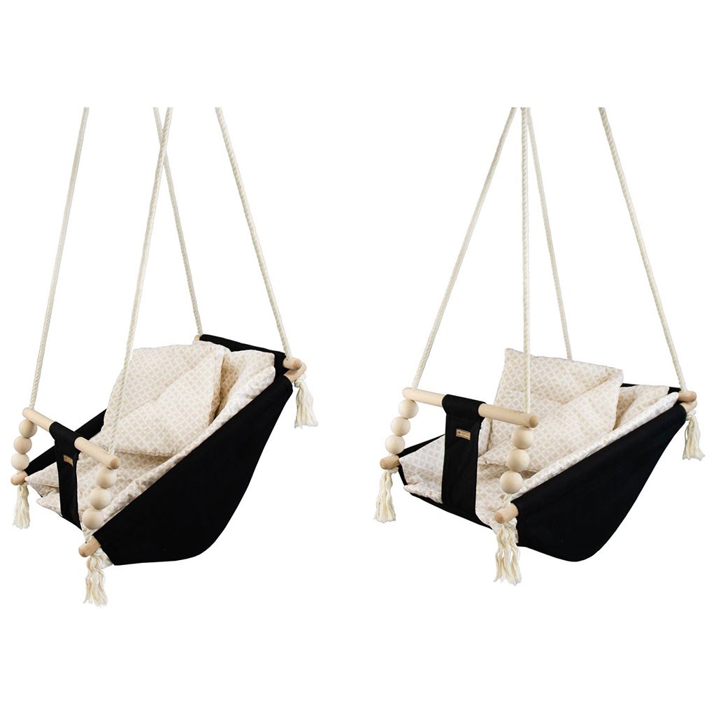 Díky použití bavlny příjemné na dotek se zde dítě cítí útulně, pohodlně a bezpečně. Silná bavlněná lana jsou vybavena kovovými kolečky, která umožní instalaci houpačky také na terasu, verandu nebo na zahradu.