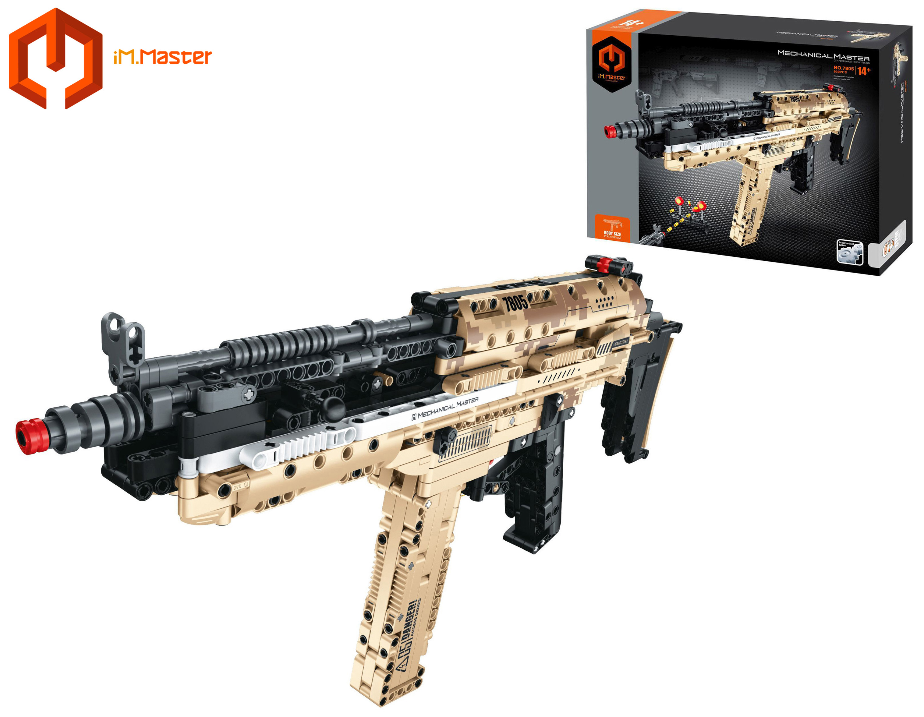 iM.Master Stavebnice kulomet střílející. Rozměry 47,4x7,3x27 cm. 939 dílků. Součástí 22 nábojů, terč. Pojistka spouště, náboje do zásobníku, natahovací nabíjení.