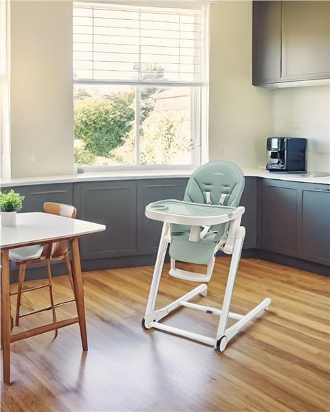 -Jídelní židlička je vybavena dvěma brzděnými kolečky a dvěma gumovými nožičkami.