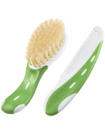 Kartáček a hřebínek Nuk. Kartáček na vlasy z jemného přírodního vlákna s hřebínkem. Kartáček jemně masíruje pokožku hlavy miminka, a tak podporuje prokrvení pokožky a posiluje vlasy a upravuje je. Hřebínek má zaoblené okraje, což usnadňuje péči o dítě. Protiskluzová rukojeť zaručí pohodlné držení hřebínku i kartáčku. Vhodné pro děti od narození.