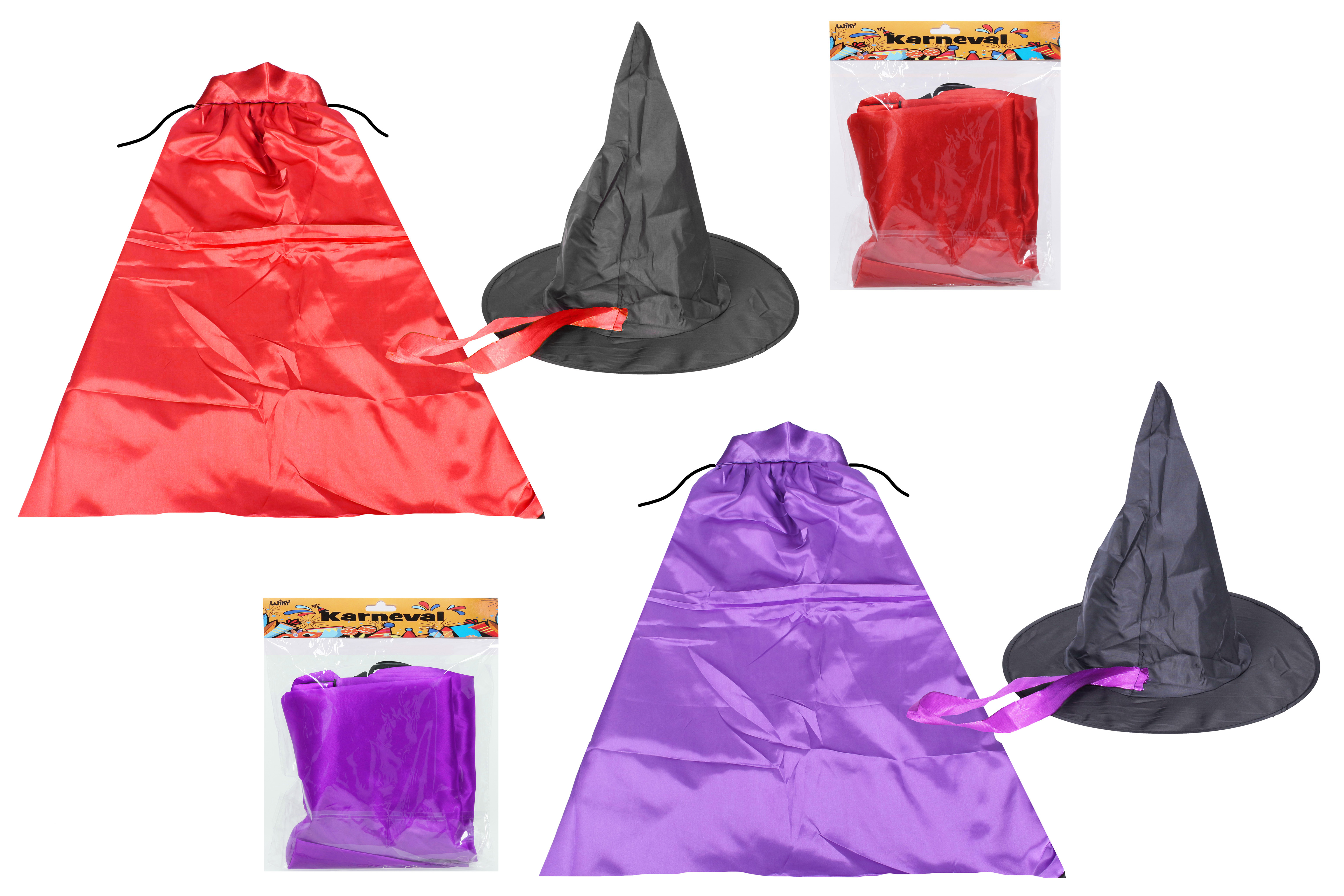 Čarodějnický plášť s kloboukem budou skvělým kostýmem na halloweenskou párty nebo na karneval! Vybrat si můžete červenou nebo fialovou variantu.