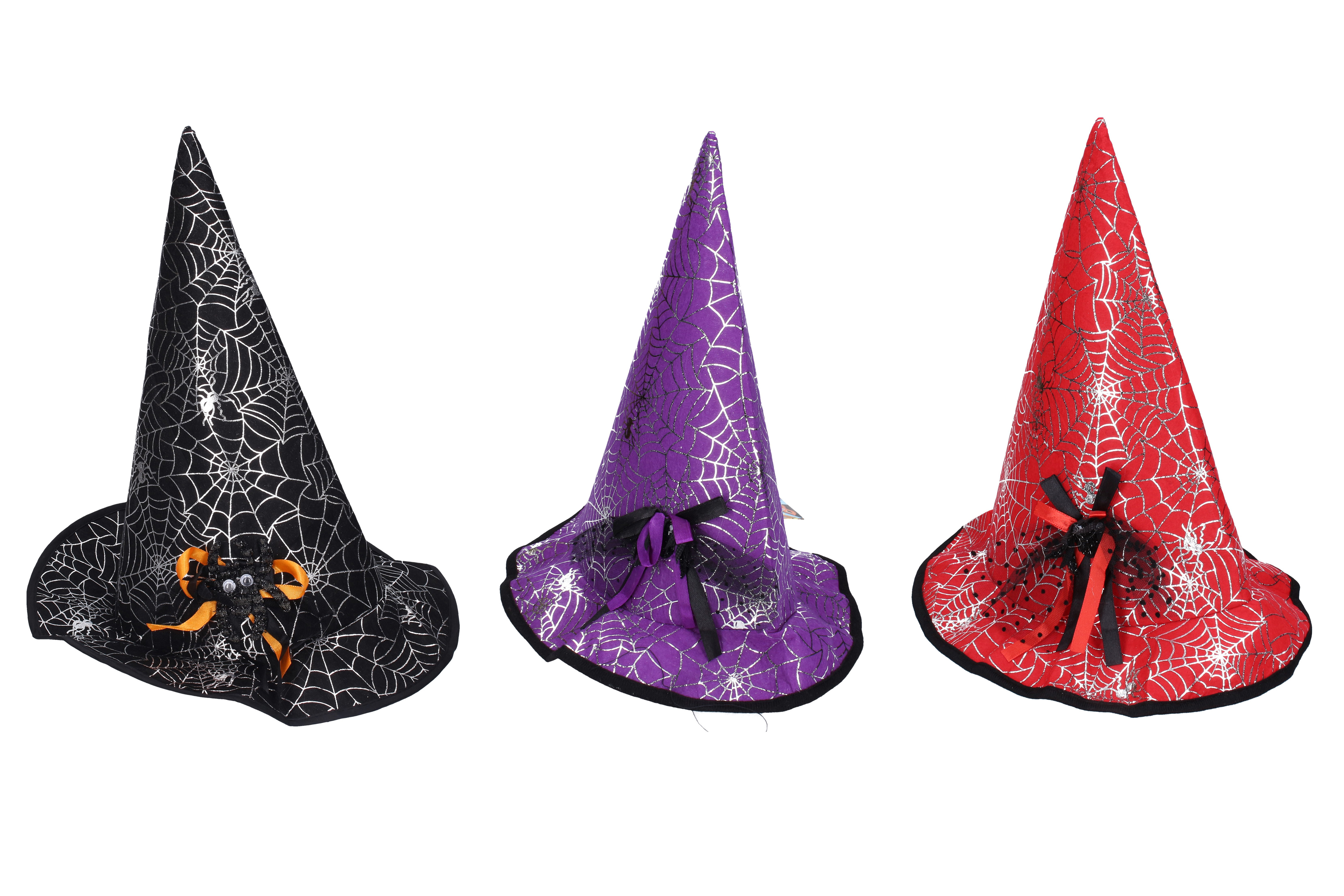 Černý klobouk s pavoukem a stříbrnými pavučinami bude skvělým doplňkem pro všechny malé čaroděje! 3 barevné provedení: černý, červený, fialový. Velikost: 32 x 30 cm
