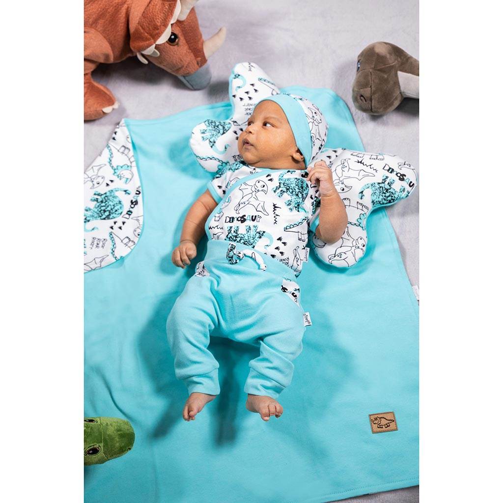 Krásná bavlněná kojenecká čepička-šátek Nicol Dinosaur. Čepička je ušitá ve stylu šátku s pružným lemem s potiskem dinosaurů. Díky příjemnému a kvalitnímu materiálu se miminko bude cítit velmi příjemně a pohodlně. Složení: 100% bavlna.