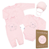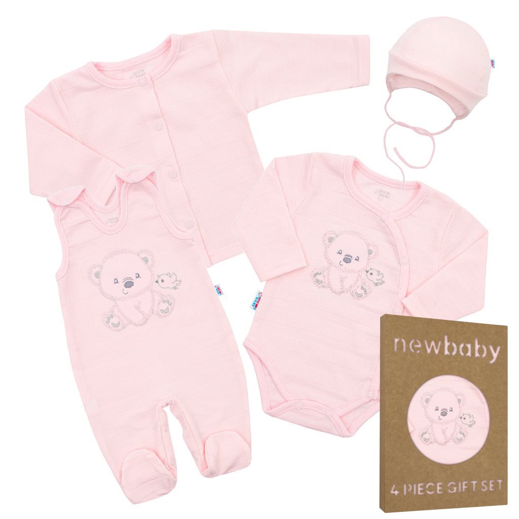 Roztomilá kojenecká 4-dílná soupravička české značky New Baby Sweet Bear pro miminka. Soupravička je vyrobena z velmi příjemňoučkého, měkkého a kvalitního materiálu, který je vhodný pro miminka a je vhodná nejen do porodnice. Obsahuje celorozepínací body s dlouhým rukávkem, dupačky, kabátek a čepičku. Celorozepínací body zdobí vyšitý obrázek medvídka a ptáčka. Dupačky zdobí roztomilý obrázek medvídka a ptáčka. Zapínání na cvočky na ramínkách a mezi nožičkami usnadní oblékání a přebalování. Kabátek je jednobarevný s krásným lemováním okolo ručiček. Zapínání je na cvočky po celé délce. Čepička je krásně tvarovaná na ouška a zavazuje se na tkaničky, díky čemuž dobře drží na hlavičce miminka a nepadá. Je velmi praktická a netlačí na hlavičku miminka. Celá soupravička má nový neobyčejný design s atraktivním vzorem látky. V této soupravičce, která je precizně a kvalitně ušitá se bude miminko cítit velmi příjemně. Je navržena s ohledem na potřeby miminka a je vhodná i jako milý dáreček. Soupravička je v praktické Eko krabičce. Složení: 100% bavlna.