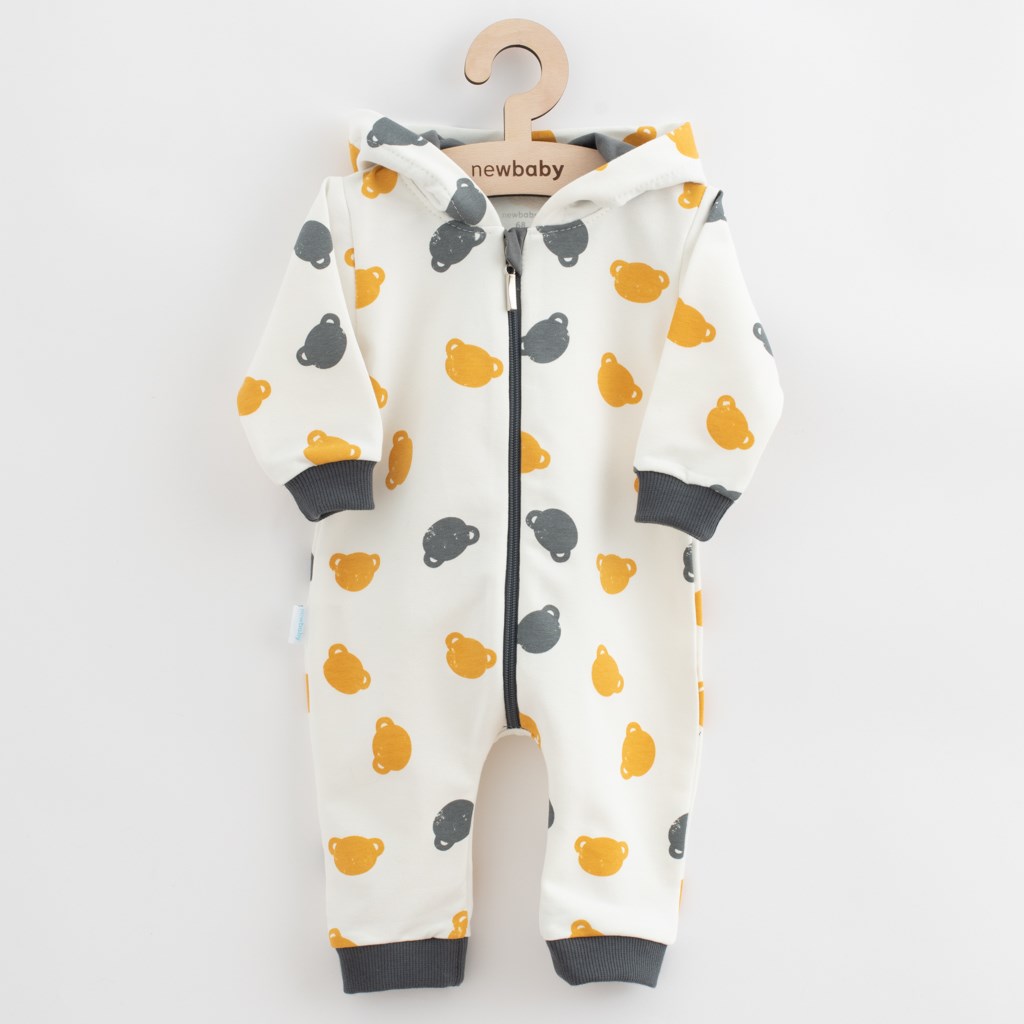 Roztomilý a praktický overal s kapucí české značky New Baby Little One. Overálek je celopotištěný medvídky, má zapínání na zip po celé délce a pružné lemy na rukávcích a nohavičkách. Kapuce je podšitá barevnou podšívkou a je zdobena roztomilou bambulkou. Overal je vyroben z pohodlné teplákoviny. Vhodný pro celoroční nošení. Materiál: 96% bavlna, 4% elastan.