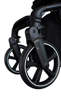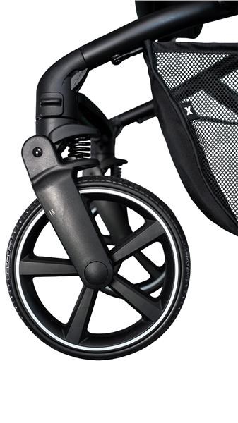 Želová kola, nastavitelná rukojeť, polohovací opěrka nohou, otočné sedadlo, bezpečnostní pásy, nožní brzda