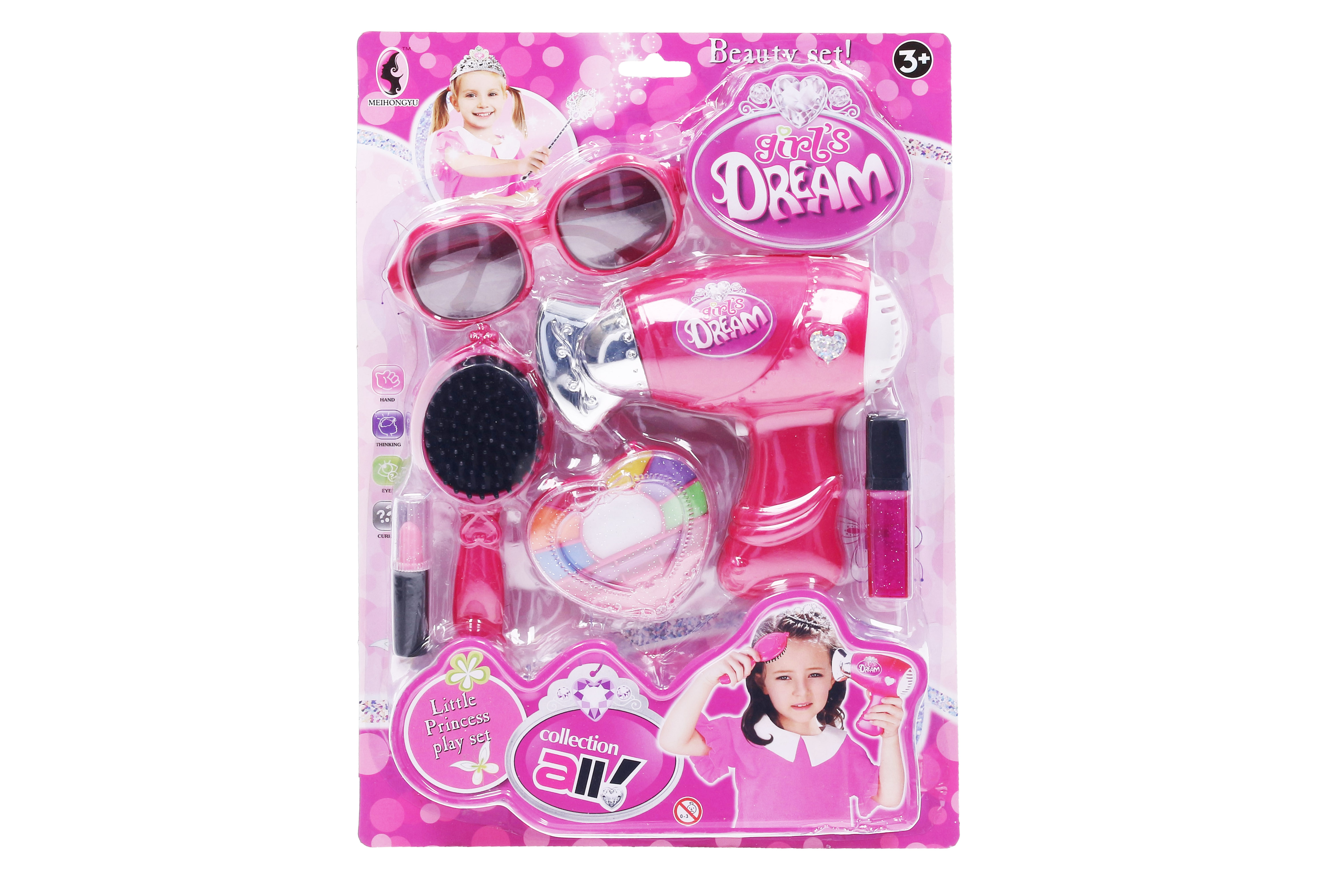 Kosmetický set. Obsahuje brýle, fén, kartáč, malování, rtěnku, parfém. 2xAA baterie fén, nejsou součástí. Aktivace foukání stiskem tlačítka.