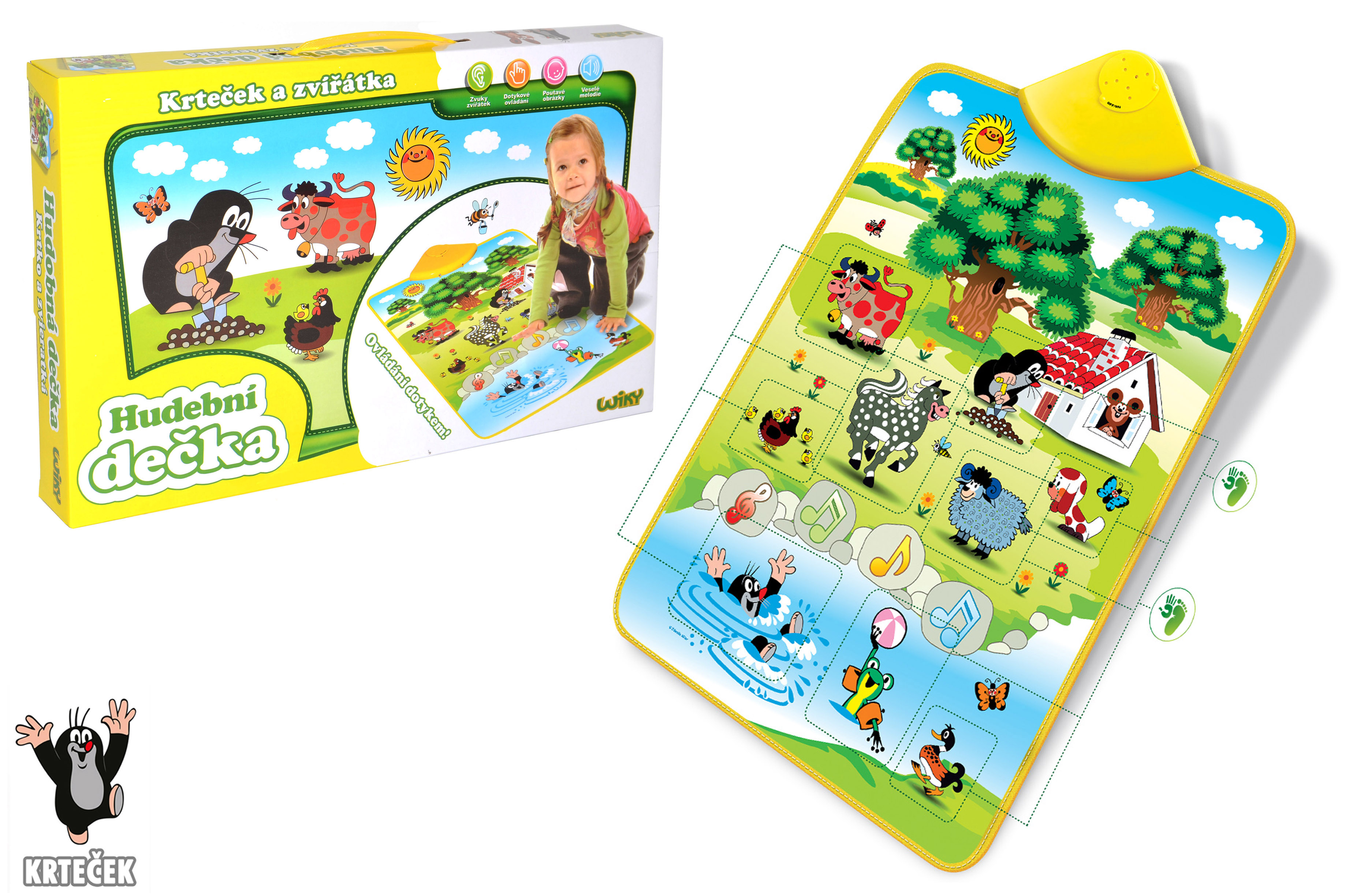 Krtek se vydal pracovat na zahradu. Poznávej s ním zvuky zvířátek na praktické měkké dečce. Rozeznej kravičku, koníka, žabičku a další zvířátka nebo rozehrej písničku. To vše pouhým stiskem ruky!