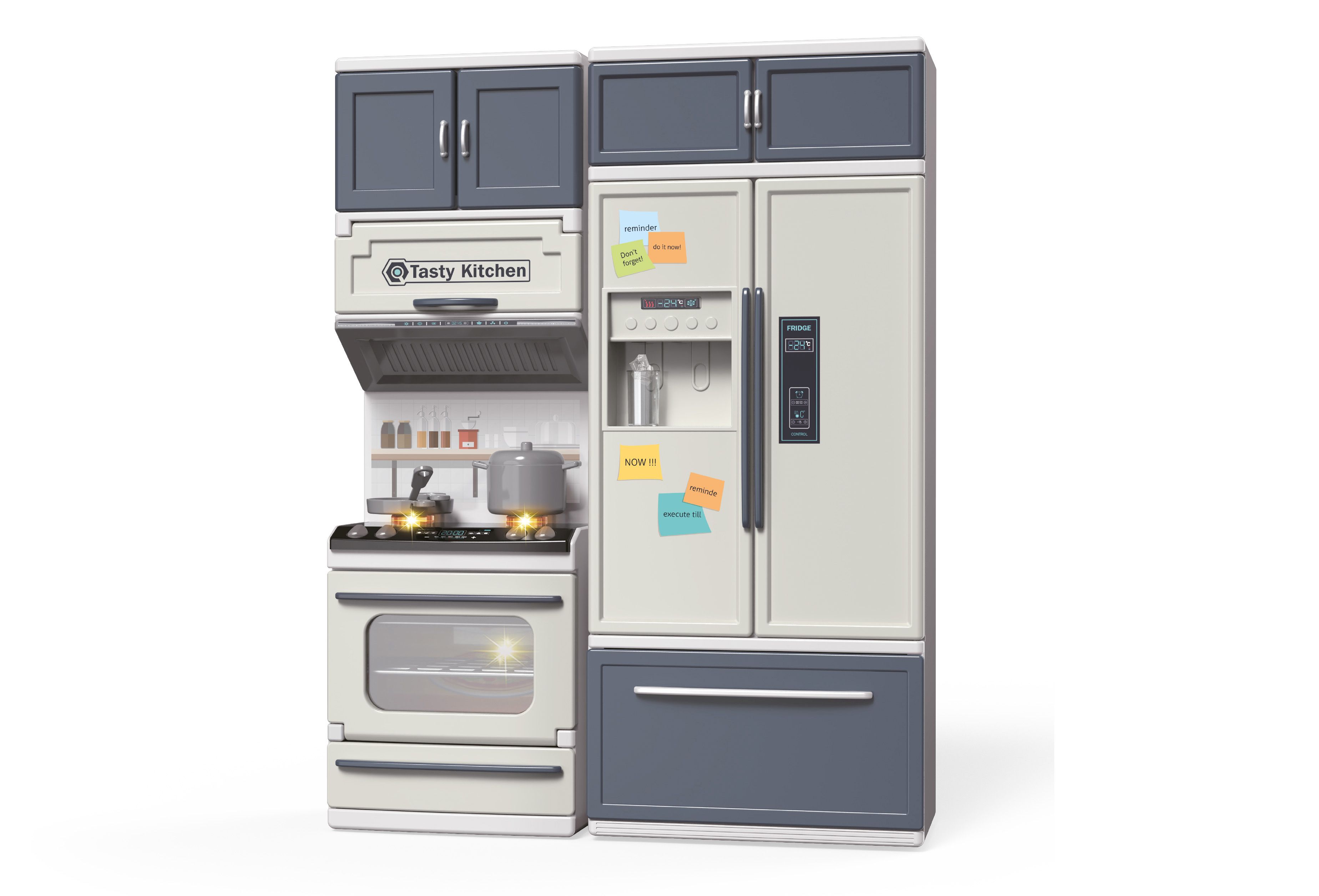 Kuchyňka s efekty. Rozměry 22,5x7x30 cm. Světelné a zvukové efekty tlačítkem na sporáku. 3xAG13 baterie do sporáku součástí. Obsah - trouba se sporákem, odpařovač, lednice, skříňky, nádobí.