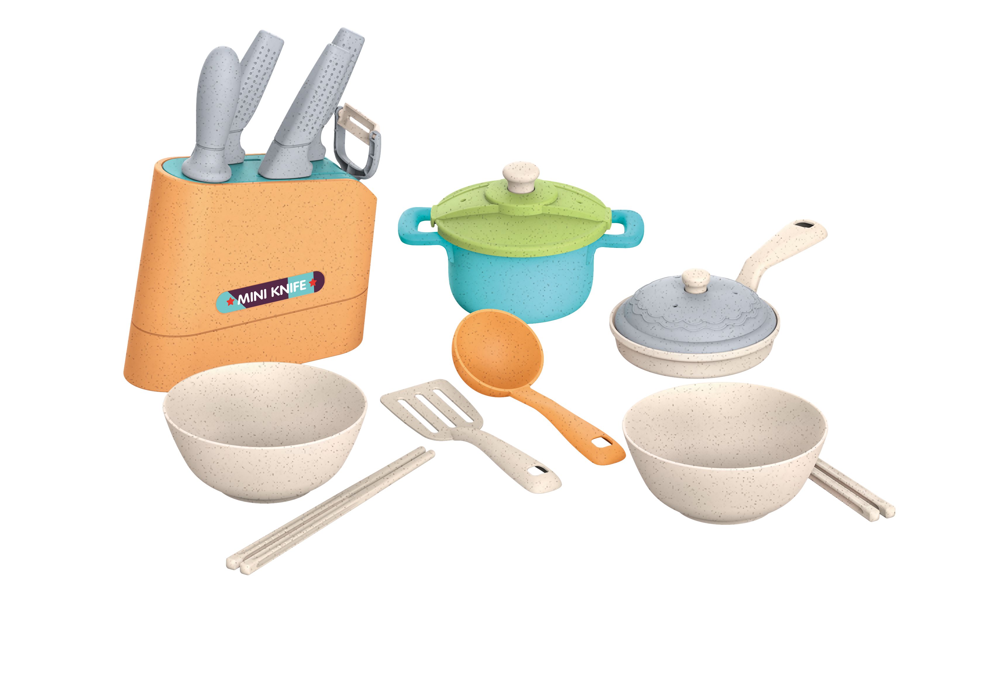 Kuchyňské nádobí Organic. Hrnec s poklicí, pánvička s poklicí, 2 misky, 3 nože, zásobník na nože, brousítko nožů, škrabka, 2 naběračky, 2 hůlky.