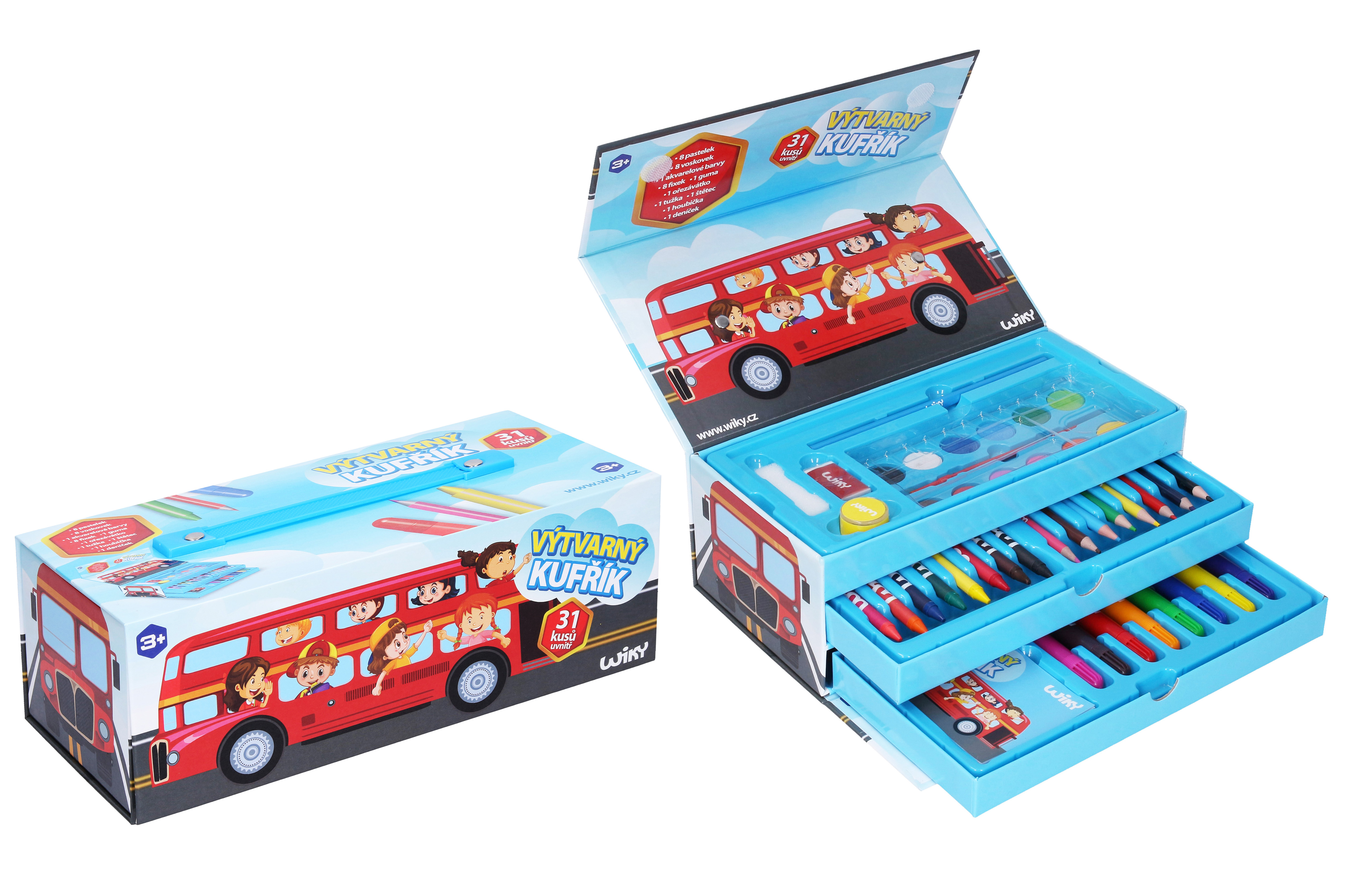 Obsahuje: 8 pastelek, 8 voskovek, 1 akvarelové barvy, 8 fixek, 1 guma, 1 ořezávátko, 1 tužka, 1 štětec, 1 houbička, 1 deníček.