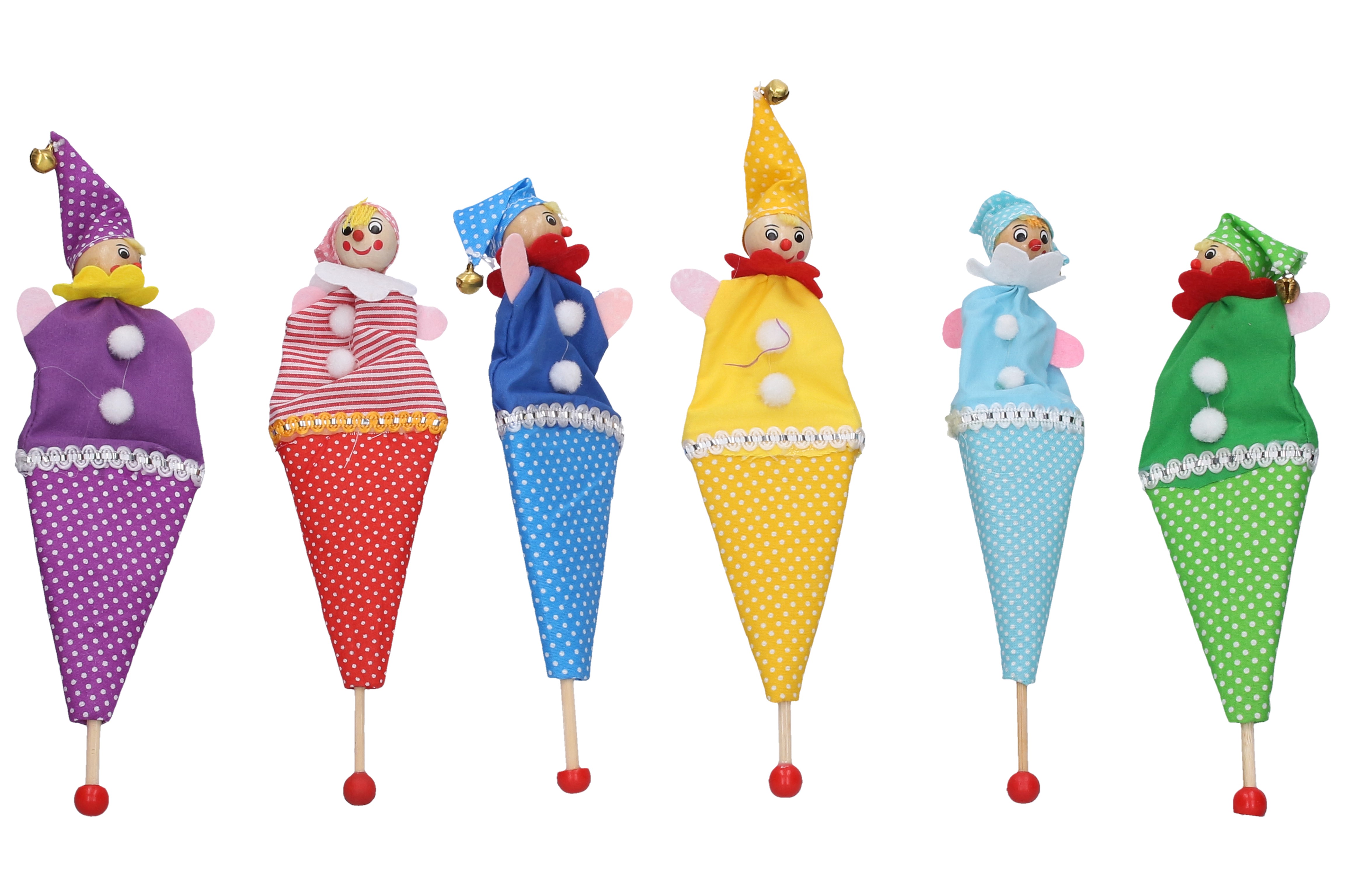 Loutka klaun. Velikost 21,5 cm. Dřevo a textil.