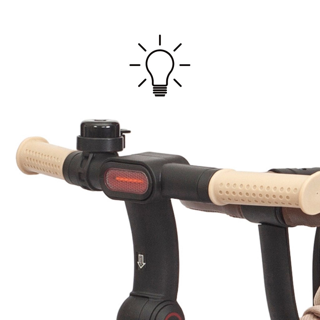 Twinkle je vybavena nastavitelnou rukojetí, funkcí volnoběhu, brzdou, bezpečnostními pásy s chrániči a pohodlným třípolohovým opěradlem a zaručuje úplnou kontrolu a pohodlí pro dítě i rodiče. Její lehký, ale odolný ocelový rám, kola s pěnovou výplní a kuličkovými ložisky, skládací konstrukce a praktické prvky, jako je síťovaná stříška, LED světlo, držák na nápoje a dva úložné boxy, z ní činí perfektní volbu pro každou příležitost – ve městě, na procházce nebo na výletě. Po odstranění rukojeti, kolejnic a stříšky lze Twinkle používat jako klasickou tříkolku.