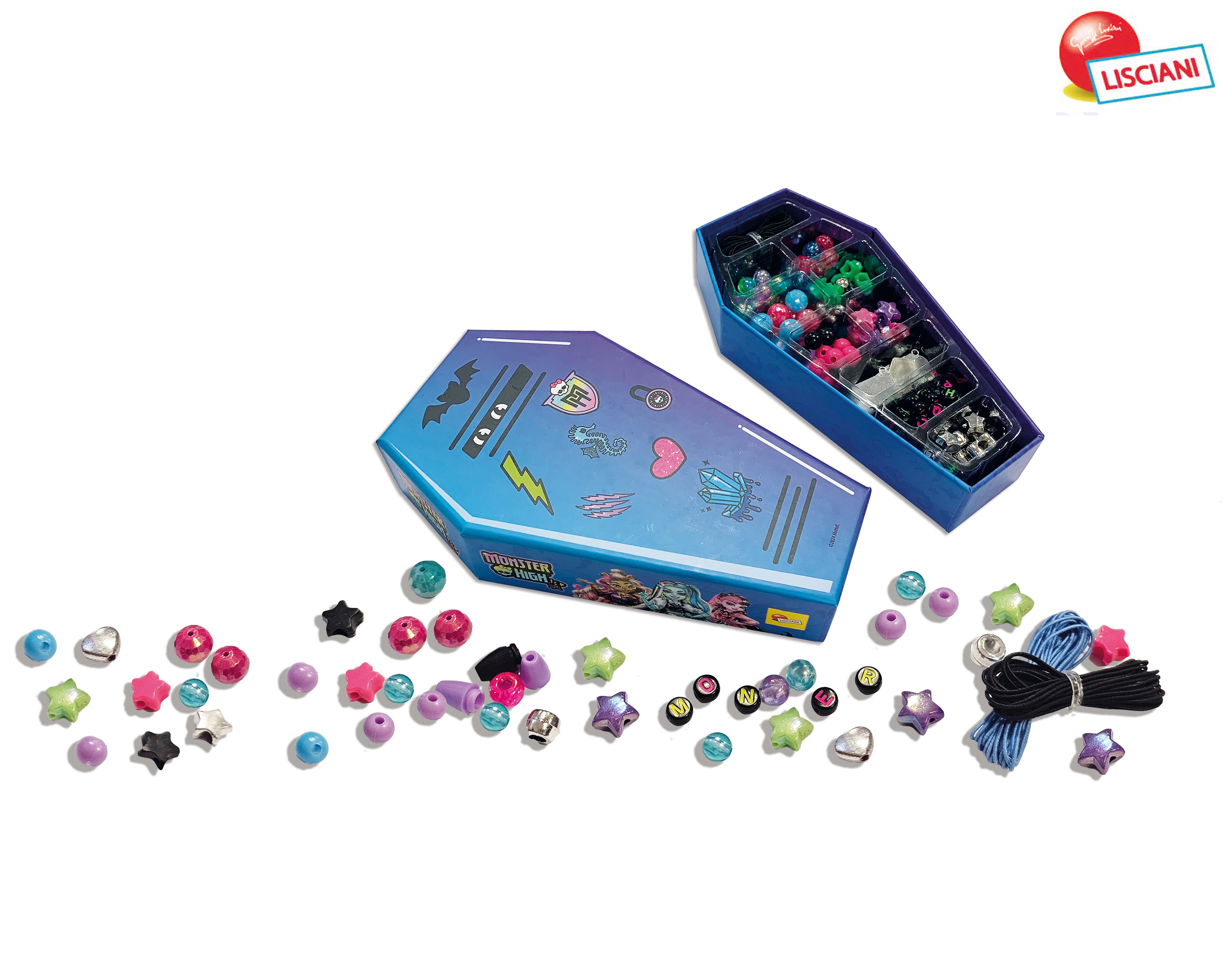Monster High DIY sada na výrobu strašidelných náramků. Krabička ve tvaru rakvičky. Obsah balení - korálky, háčky, provázky, a přívěsky s motivy příšerek.