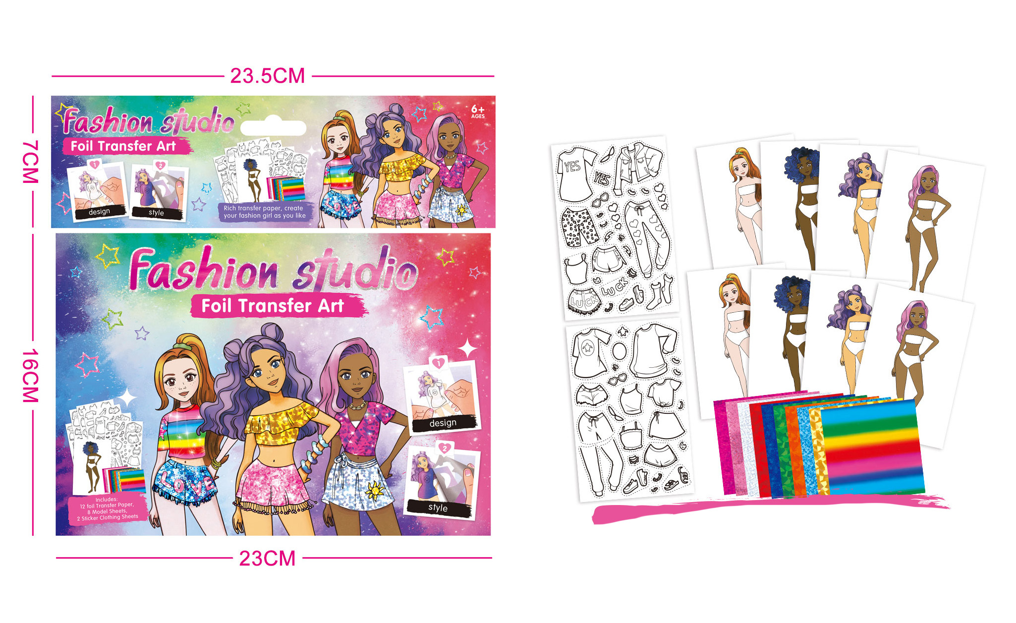 Návrhářské portfolio. Obsahuje 8 modelek, 2 listy šablon oblečení, 12 barevných lepicích fólií. Obrázkový a textový návod na zadní straně obalu.