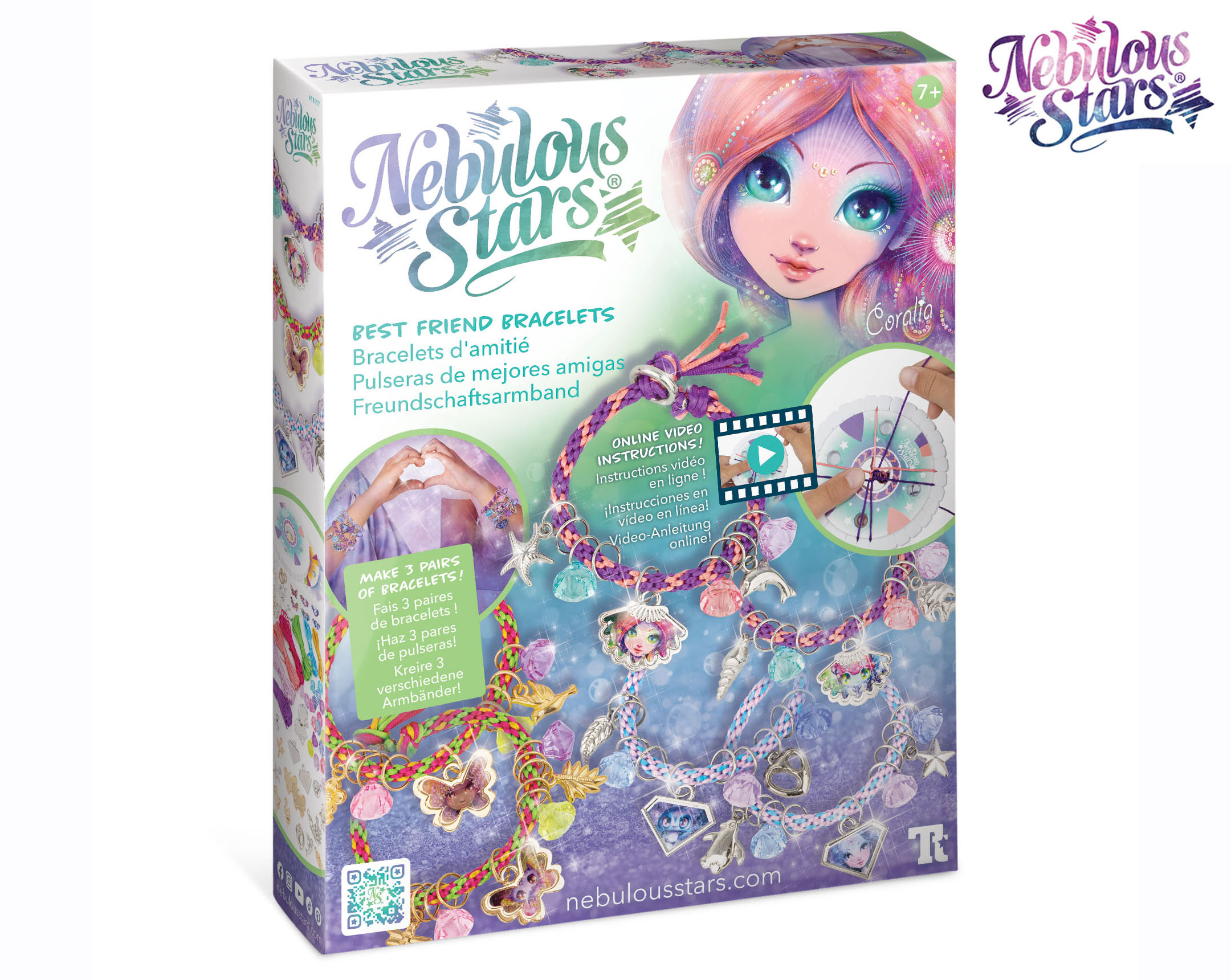 Nebulous Stars Náramky přátelství Coralia. Set na výrobu náramků přátelství. Obrázkový návod na 3 vzory náramků v balení. Obsah balení - bavlnky 7 barev, 18 přívěšků, 18 korálků, 6 epoxidových samolepek, 60 kroužků, 6 sponek, příběh, návod.