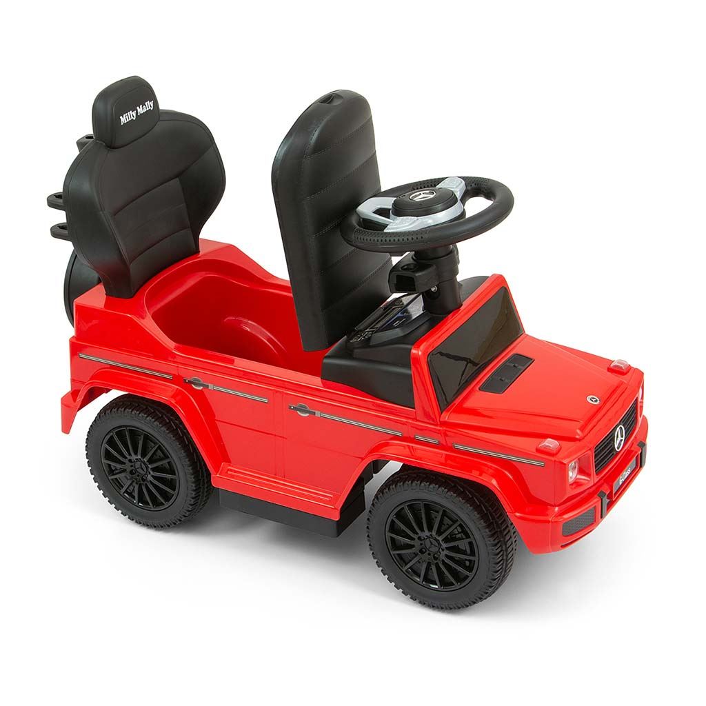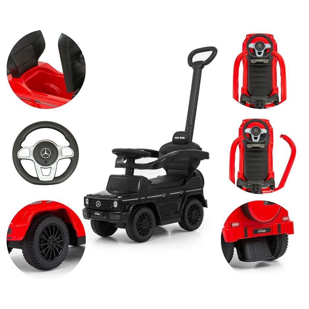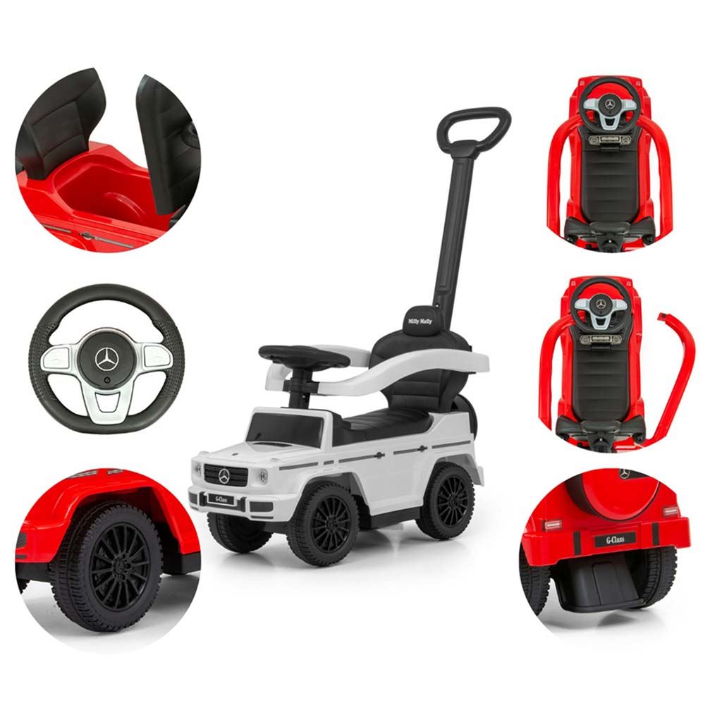 Dětské odrážedlo s vodící tyčí MERCEDES G350d je vyrobeno v licenci koncernu MERCEDES. Váš malý závodník či závodnice se v něm bude cítit jako v opravdovém džípu. Odrážedlo je vyrobeno s důrazem na každý detail a kvalitu použitých materiálů. Jeho vzhled upoutá pozornost nejen každého dítěte, ale i rodiče. Odrážedlo pomáhá rozvíjet motorické schopnosti dítěte a Váš malý závodník či závodnice si s ním užije spoustu zábavy a legrace. Autíčko má na tříramenném volantu tlačítka vydávající různé melodie, zvuk motoru nebo houkačku. Je určeno jak pro nejmenší děti, které už umí sedět, tak i pro děti, které se už naučily chodit. Odrážedlo má otočná přední kola, široké a komfortní sedadlo s úložným prostorem a pohodlnou a zároveň pevnou vodící tyč, kterou lze odrážedlo řídit. Vodící tyč, opěrky na ruce a podnožky lze sundat a tím dítě využije autíčko jako klasické odrážedlo. Baterie nejsou součástí balení (2x AA 1.5V).