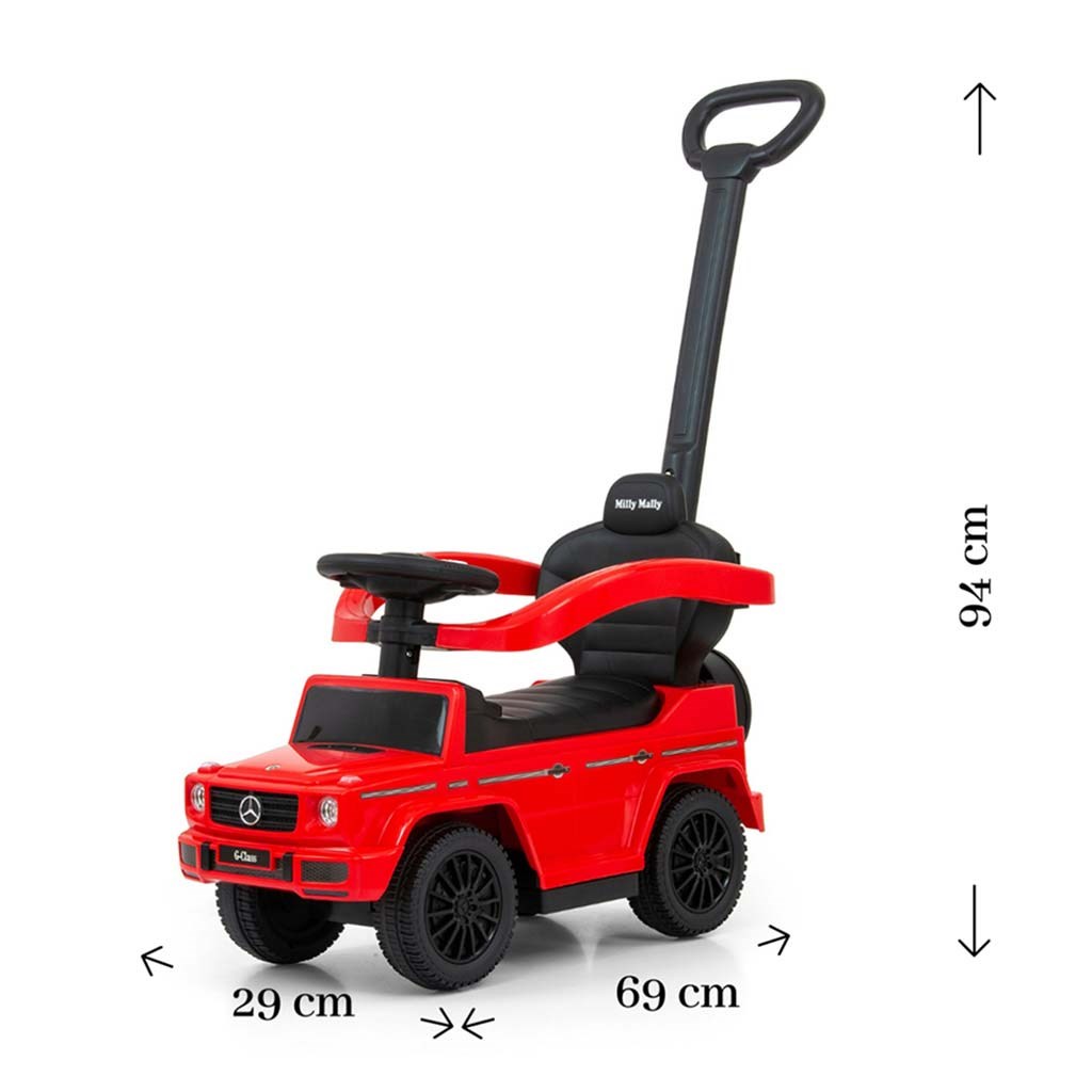 Dětské odrážedlo s vodící tyčí MERCEDES G350d je vyrobeno v licenci koncernu MERCEDES. Váš malý závodník či závodnice se v něm bude cítit jako v opravdovém džípu. Odrážedlo je vyrobeno s důrazem na každý detail a kvalitu použitých materiálů. Jeho vzhled upoutá pozornost nejen každého dítěte, ale i rodiče. Odrážedlo pomáhá rozvíjet motorické schopnosti dítěte a Váš malý závodník či závodnice si s ním užije spoustu zábavy a legrace. Autíčko má na tříramenném volantu tlačítka vydávající různé melodie, zvuk motoru nebo houkačku. Je určeno jak pro nejmenší děti, které už umí sedět, tak i pro děti, které se už naučily chodit. Odrážedlo má otočná přední kola, široké a komfortní sedadlo s úložným prostorem a pohodlnou a zároveň pevnou vodící tyč, kterou lze odrážedlo řídit. Vodící tyč, opěrky na ruce a podnožky lze sundat a tím dítě využije autíčko jako klasické odrážedlo. Baterie nejsou součástí balení (2x AA 1.5V).